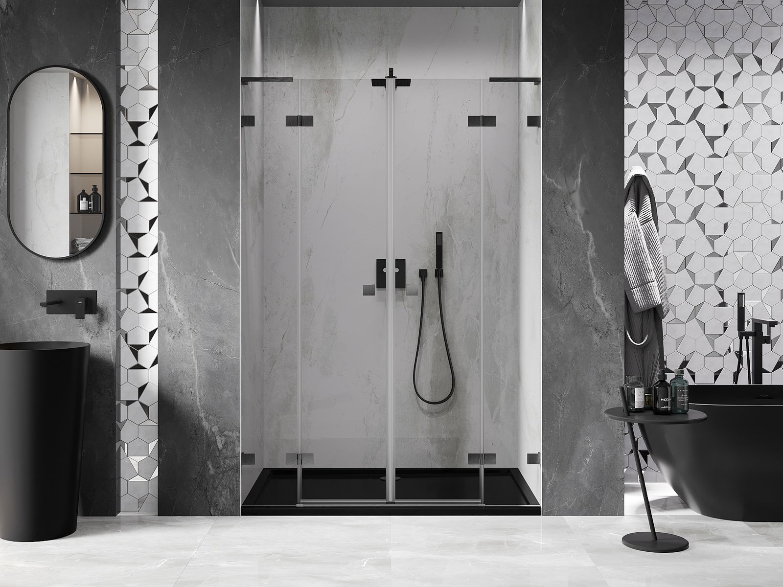 La poignée pratique et confortable est fabriquée en métal durable et résistant. Sa forme à la mode, combinée à une finition assortie à la couleur des profilés, donne à l'ensemble un aspect moderne et stylé, soulignant l'esthétique de chaque salle de bain.