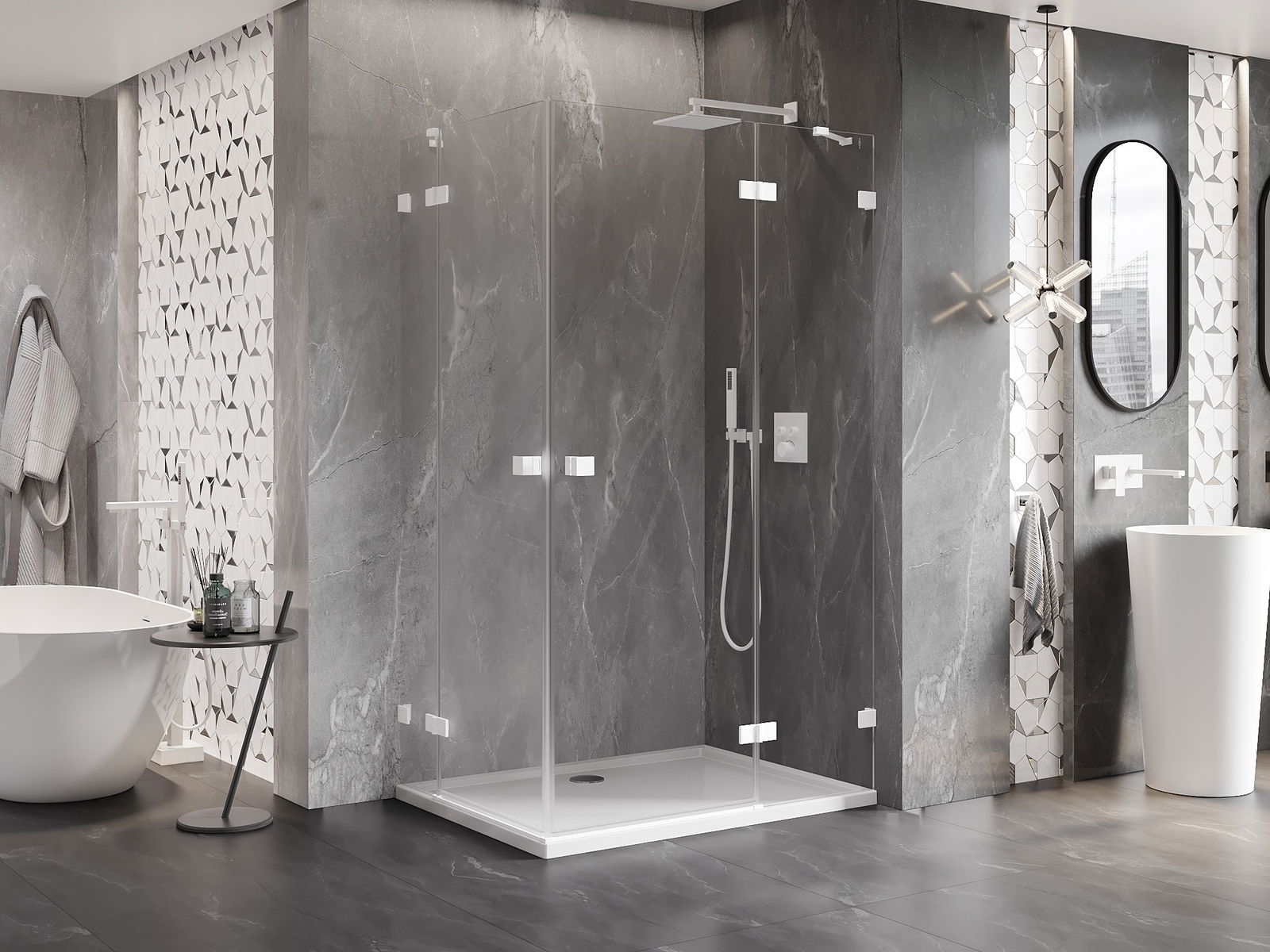 La poignée pratique et confortable est fabriquée en métal durable et résistant. Sa forme à la mode, combinée à une finition assortie à la couleur des profilés, donne à l'ensemble un aspect moderne et stylé, soulignant l'esthétique de chaque salle de bain.