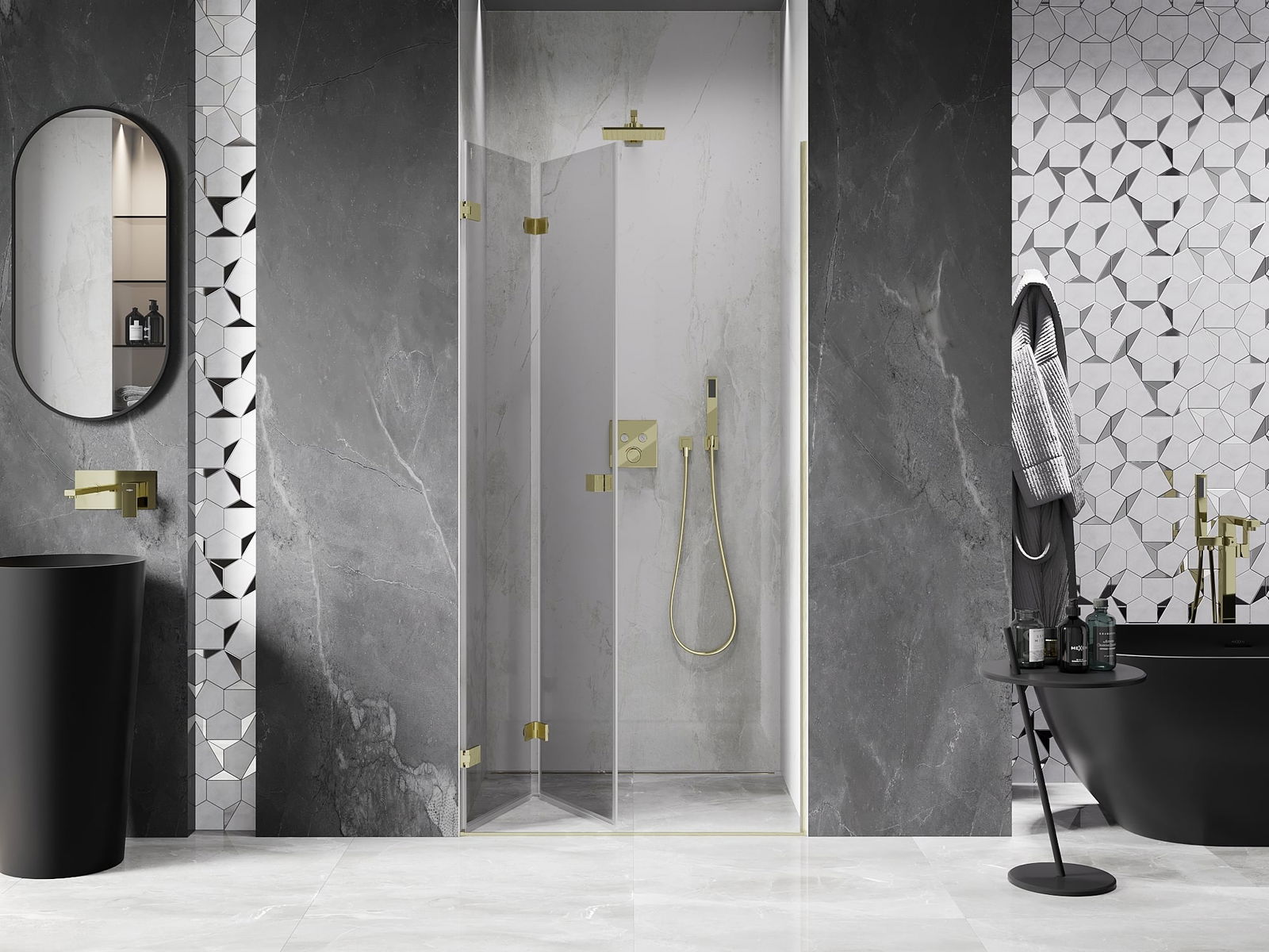 La poignée pratique et confortable est fabriquée en métal durable et résistant. Sa forme à la mode, combinée à une finition assortie à la couleur des profilés, donne à l'ensemble un aspect moderne et stylé, soulignant l'esthétique de chaque salle de bain.