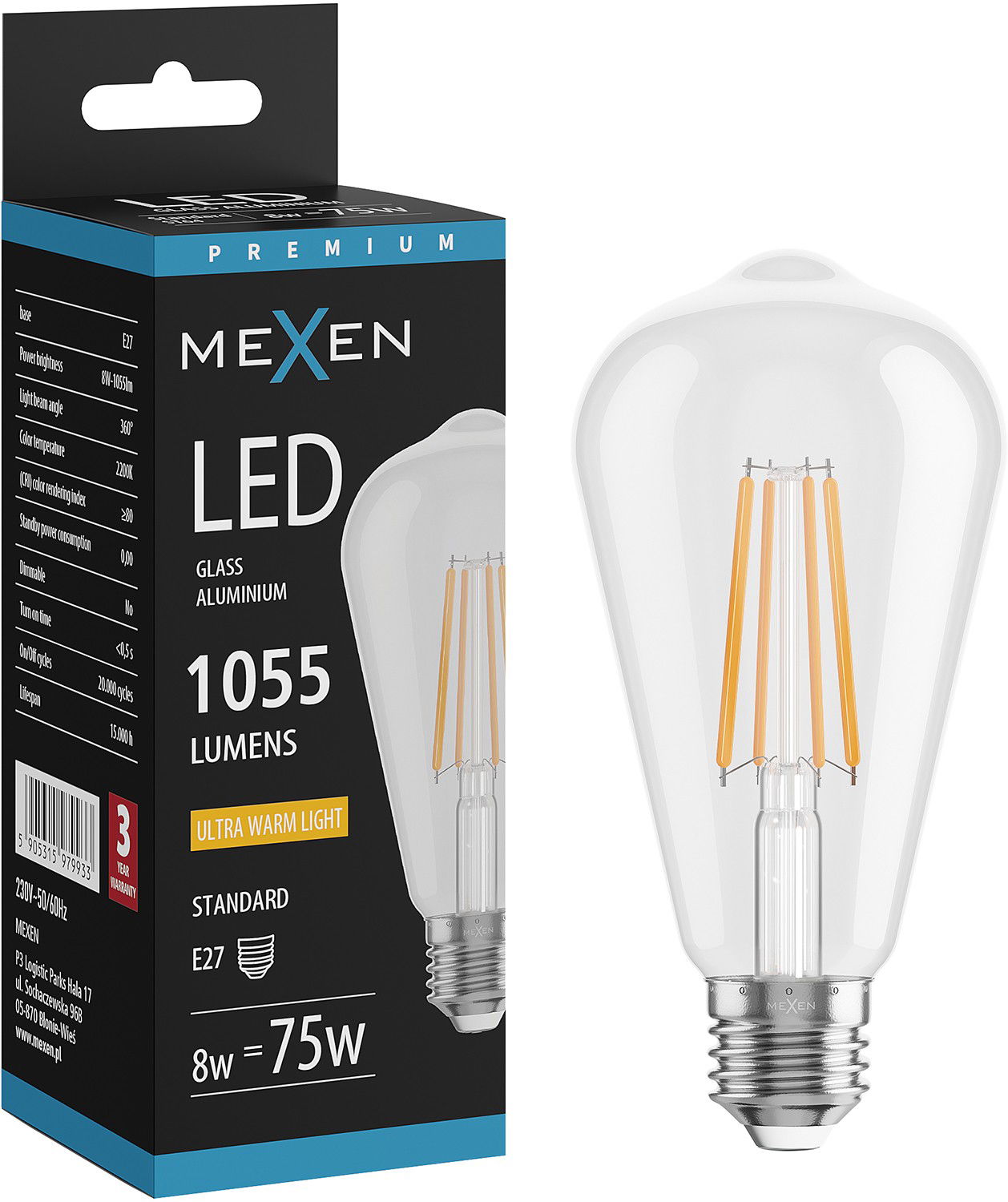 Mexen Vintis Ampoule filament LED E27, ST64, 8W, Chaude - 2200K, 1055 lm, clair - L152-E27-0822-00