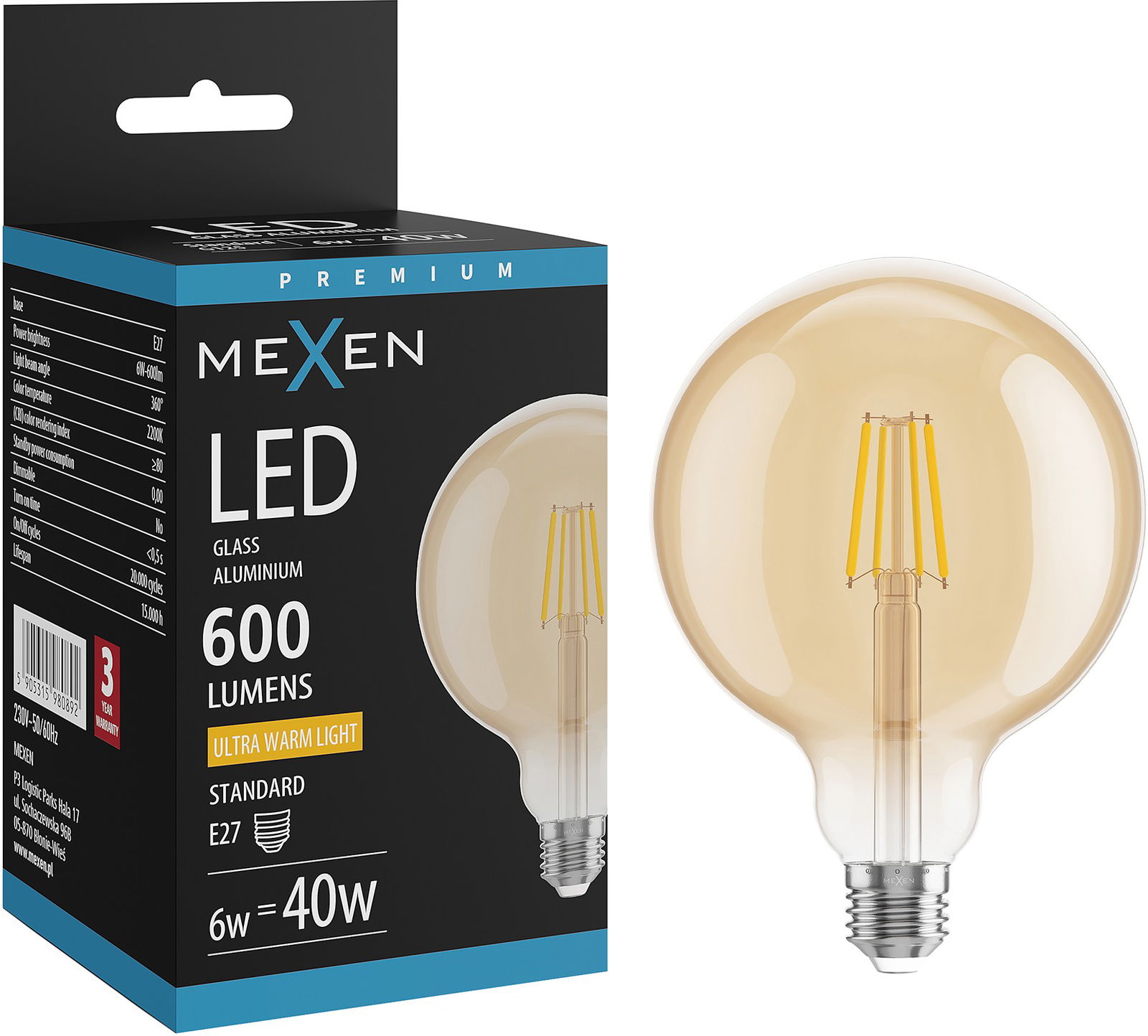 Mexen Vintis Ampoule filament LED E27, G125, 6W, Chaude - 2200K, 600 lm, ambre - L158-E27-0622-50