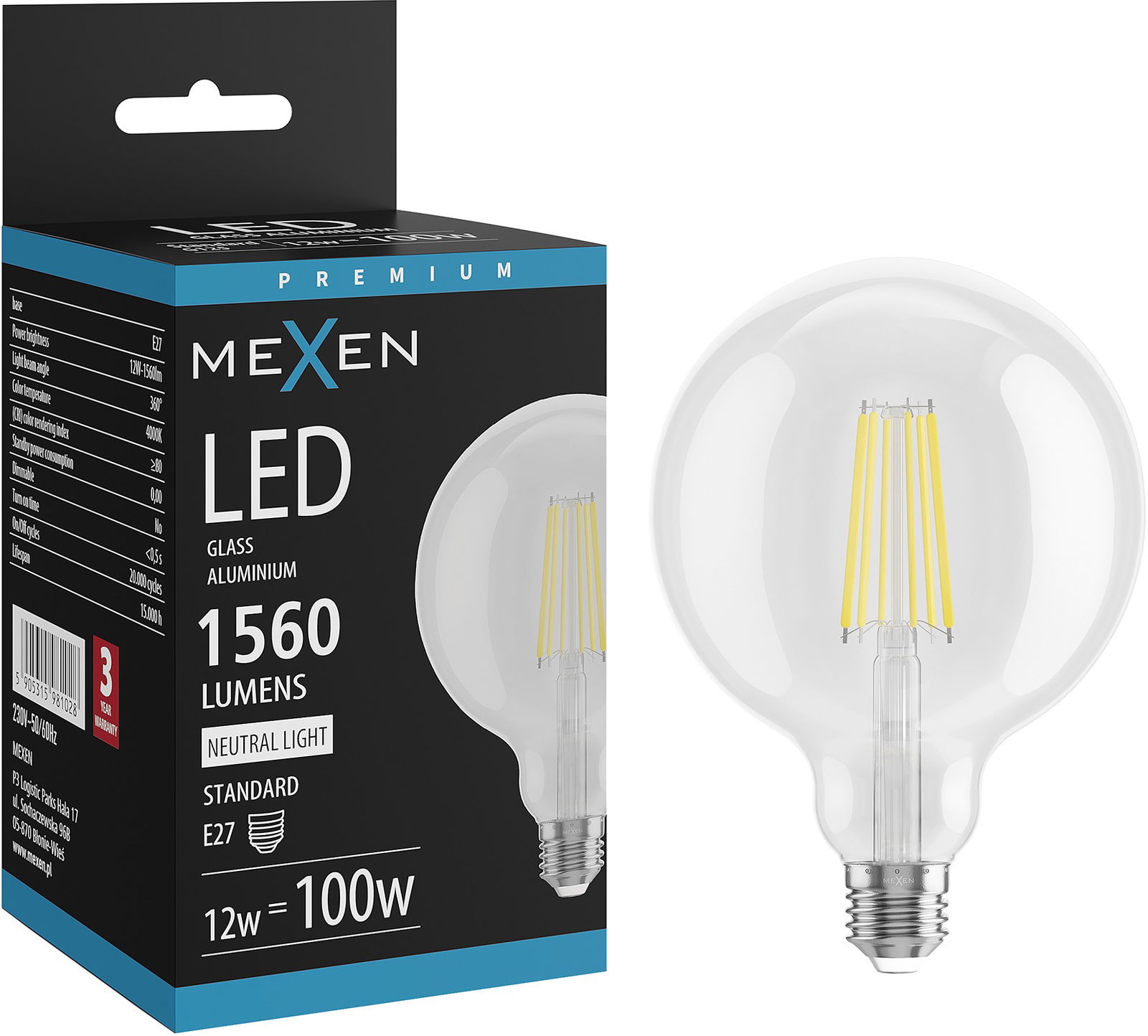 Mexen Vintis Ampoule filament LED E27, G125, 12W, Neutre - 4000K, 1560 lm, transparent - L158-E27-1240-00