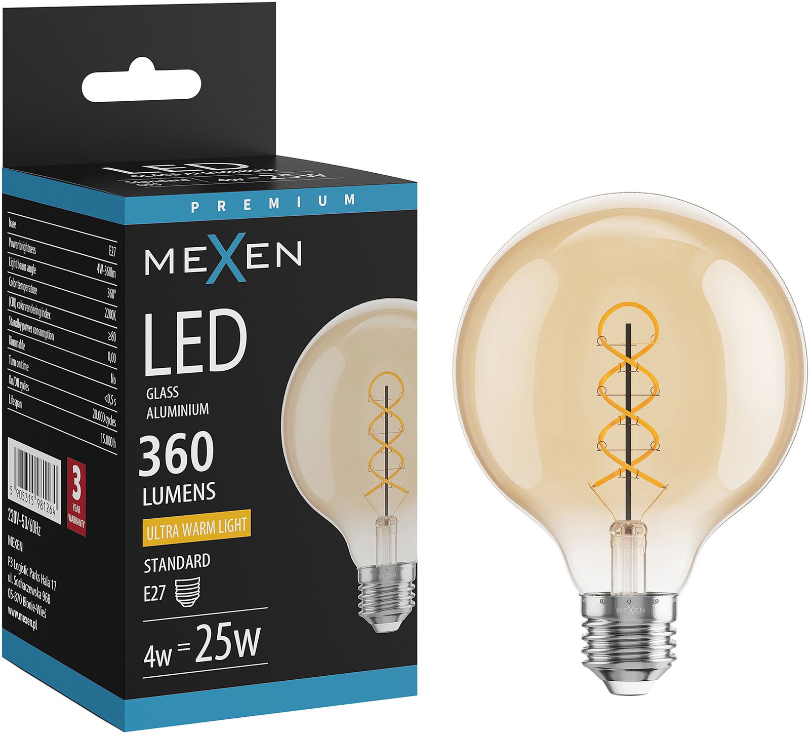 Mexen Vintis Ampoule filament spirale LED E27, G95, 4W, Chaleur - 2200K, 360 lm, ambre - L167-E27-0422-50