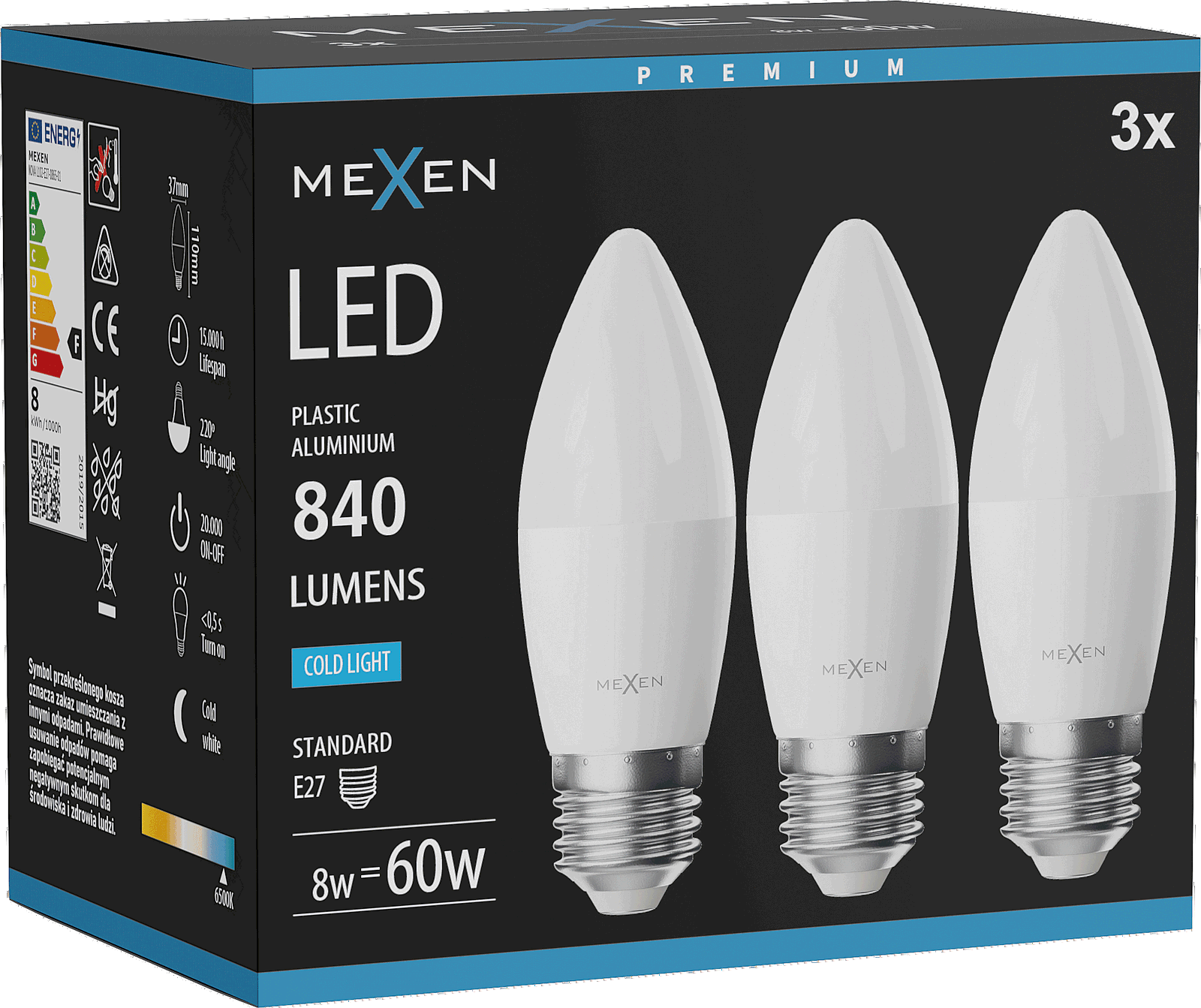 Mexen Nova 3x Ampoule LED E27, C37, 8W, Froid - 6500K, 840 lm - L102-E27-0865-01x03