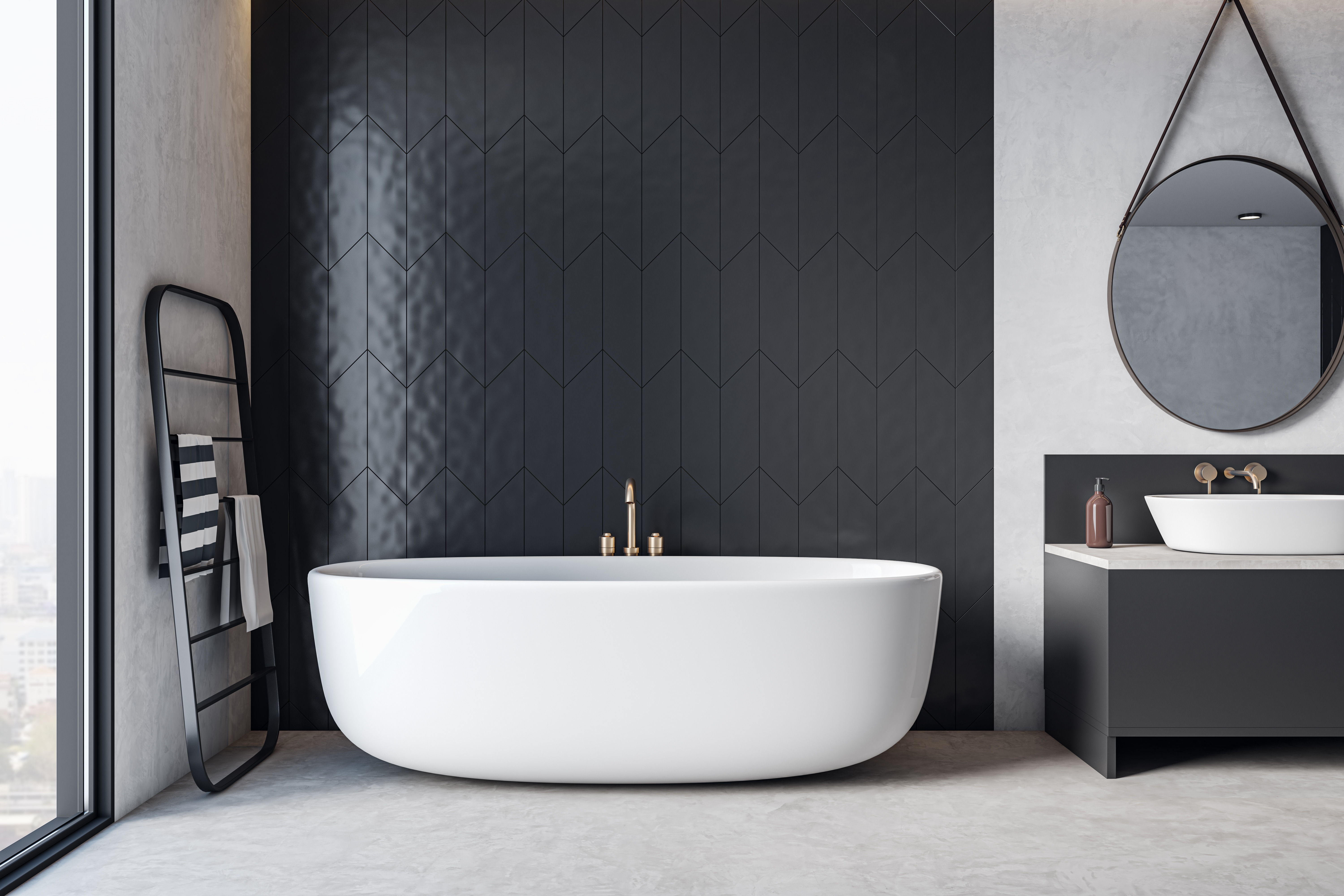 Les salles de bains modernes présentent une belle allure avec de la robinetterie noire. Les lavabos en composite sombre et les baignoires autoportantes noires sont populaires. Cependant, ces surfaces sont plus difficiles à maintenir propres en raison de la visibilité accrue des dépôts par rapport à la robinetterie blanche.