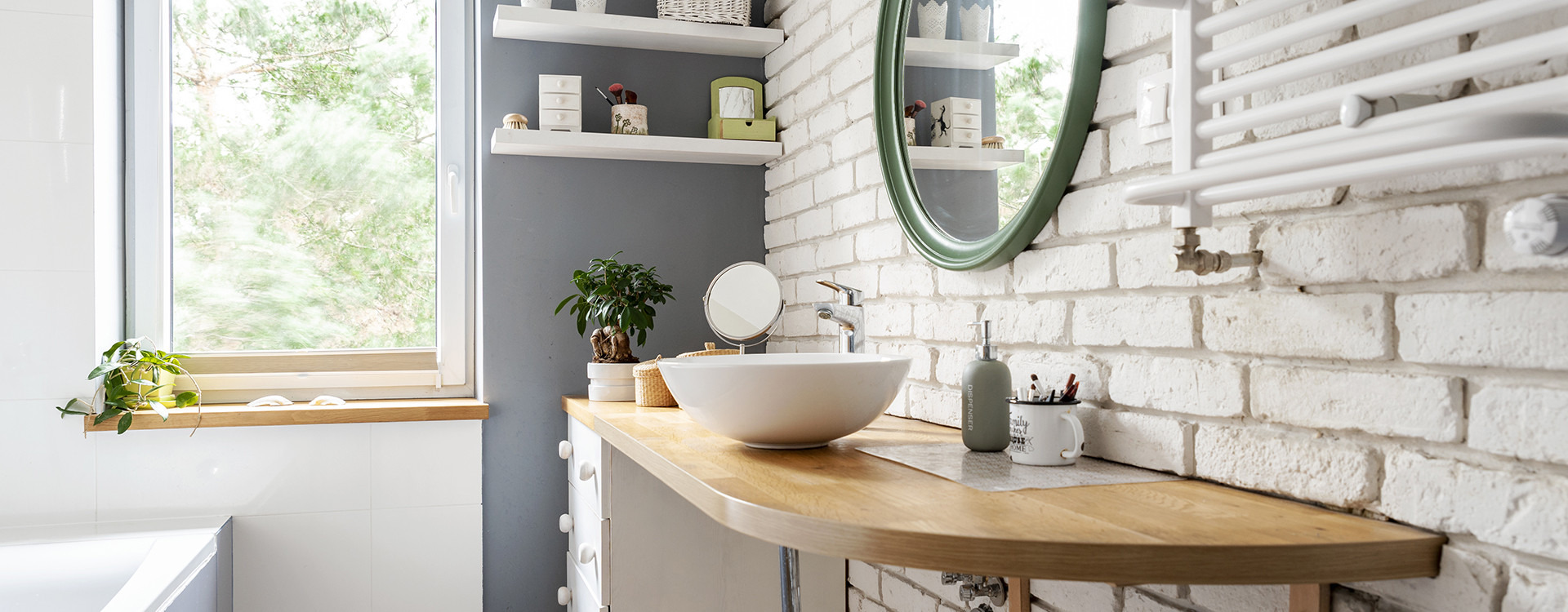 Une autre forme de mise en valeur de notre salle de bain scandinave est la brique – brute ou blanchie. Cet élément peut également être obtenu à partir d'une imitation, comme des carreaux de céramique fabriqués sous cette forme.