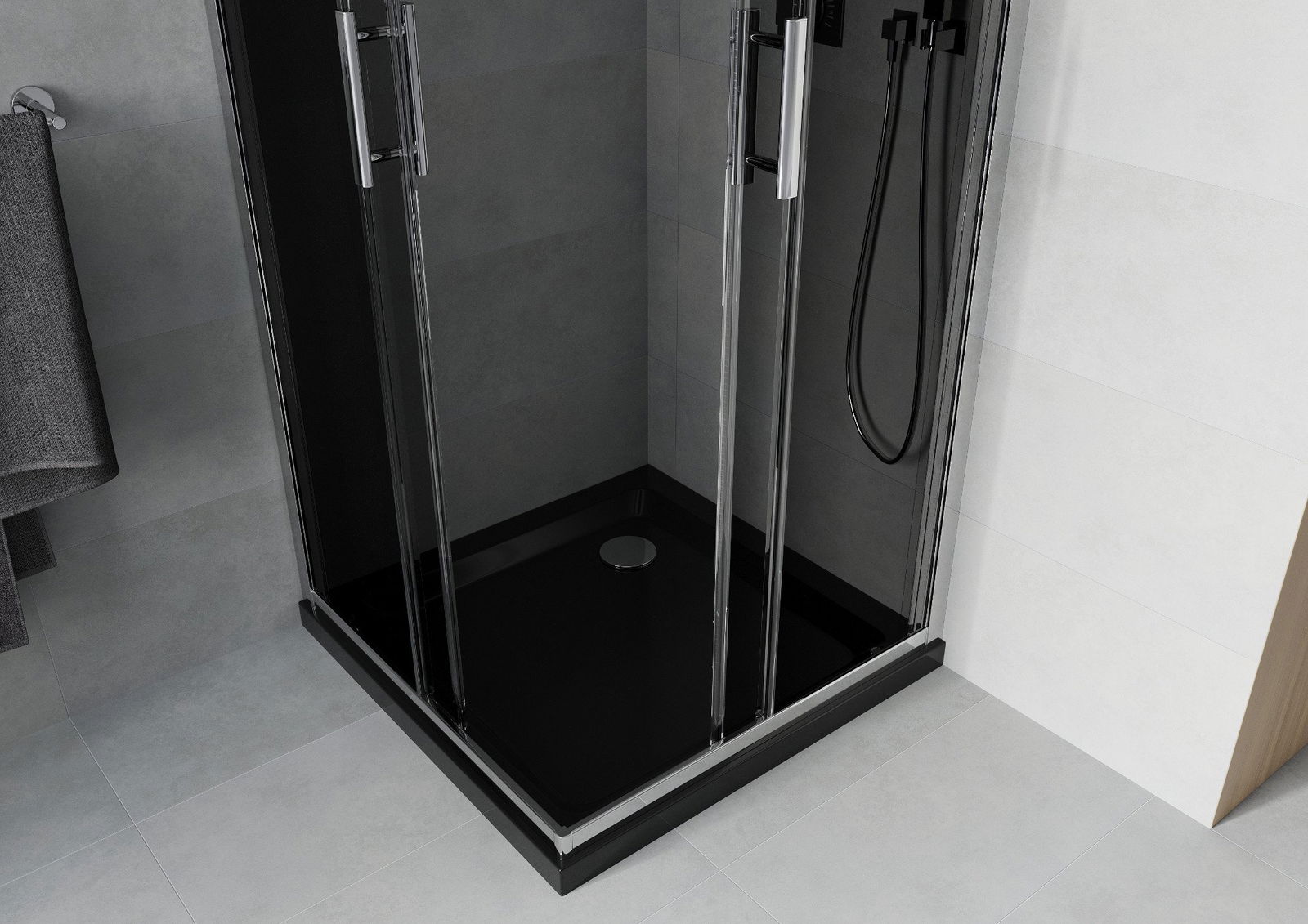 Der praktische und bequeme Griff bestand aus langlebigem und widerstandsfähigem Metall. Die modische Form in Kombination mit einem auf die Farbe der Profile zugeschnittenen Finish verleiht dem Ganzen einen modernen und stilvollen Look und betont die Ästhetik jedes Badezimmers.