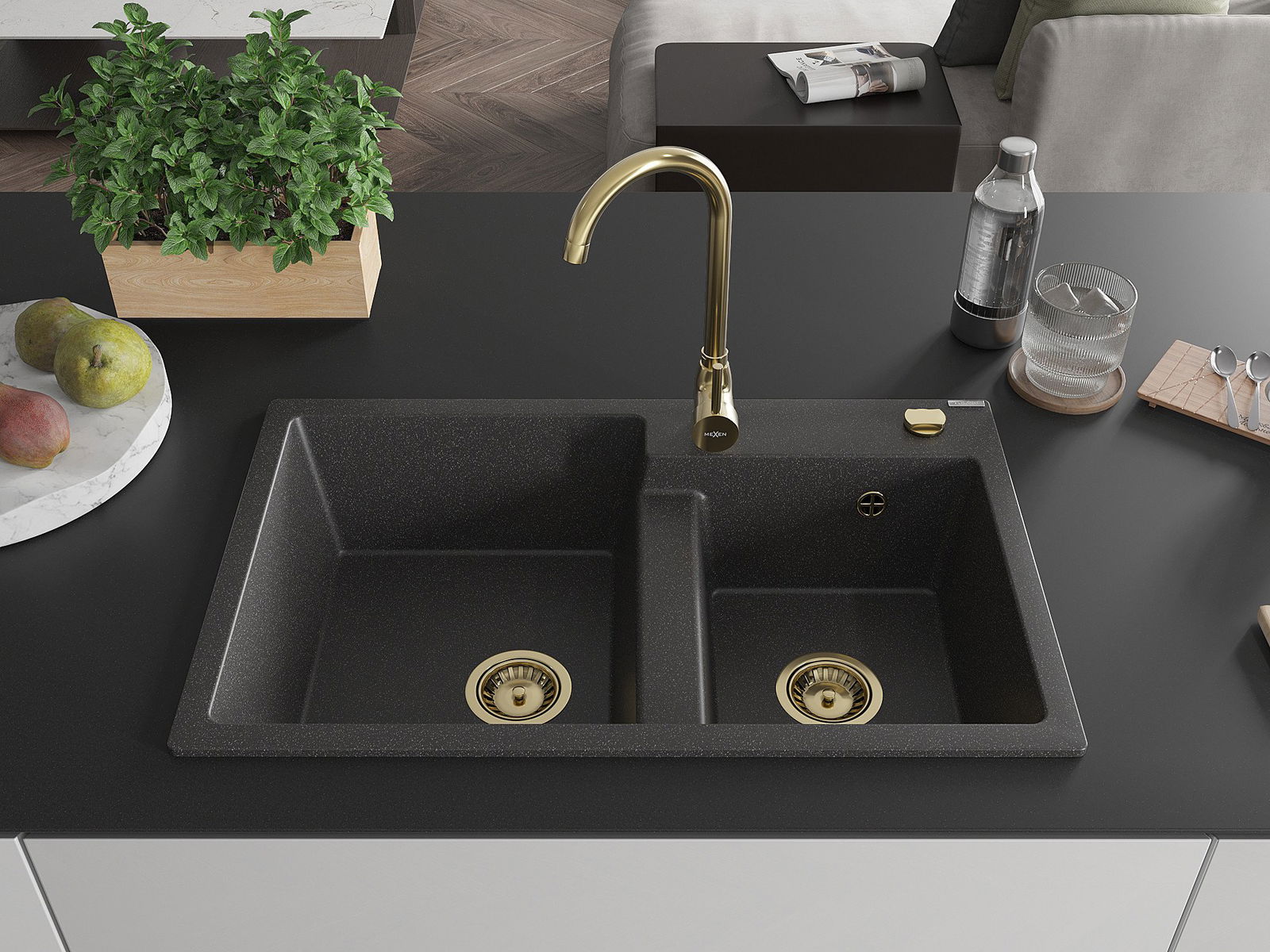 Mexen Tomas Granitspüle 2-Kammer 800 x 500 mm, schwarz gesprenkelt, goldener Siphon - 6516802000-76-G