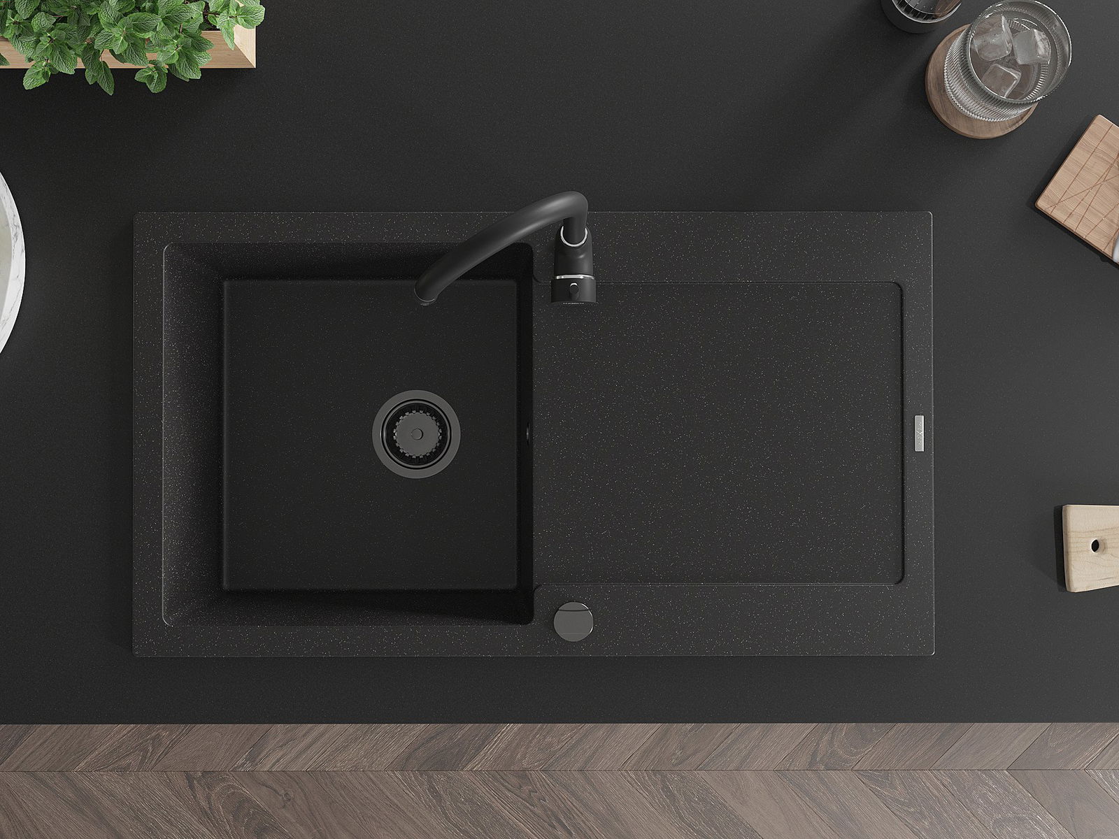 Dank des universellen Montagesystems ist die Spüle reversibel und der Abfluss kann links oder rechts auf der Theke montiert werden. Auf diese Weise können Sie die Seite einfach an Ihre Bedürfnisse und Bedingungen einstellen.