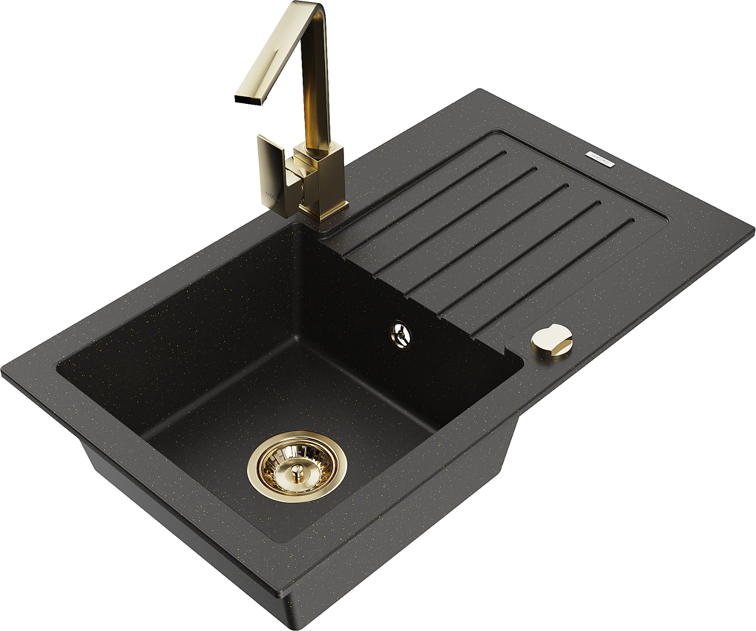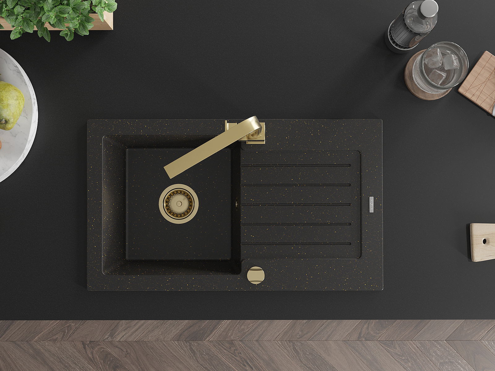 Mexen Pablo Granitspüle mit 1 Becken, Abtropffläche und Kücharmatur Rita, schwarz/gold metallic- 6510-75-670300-50