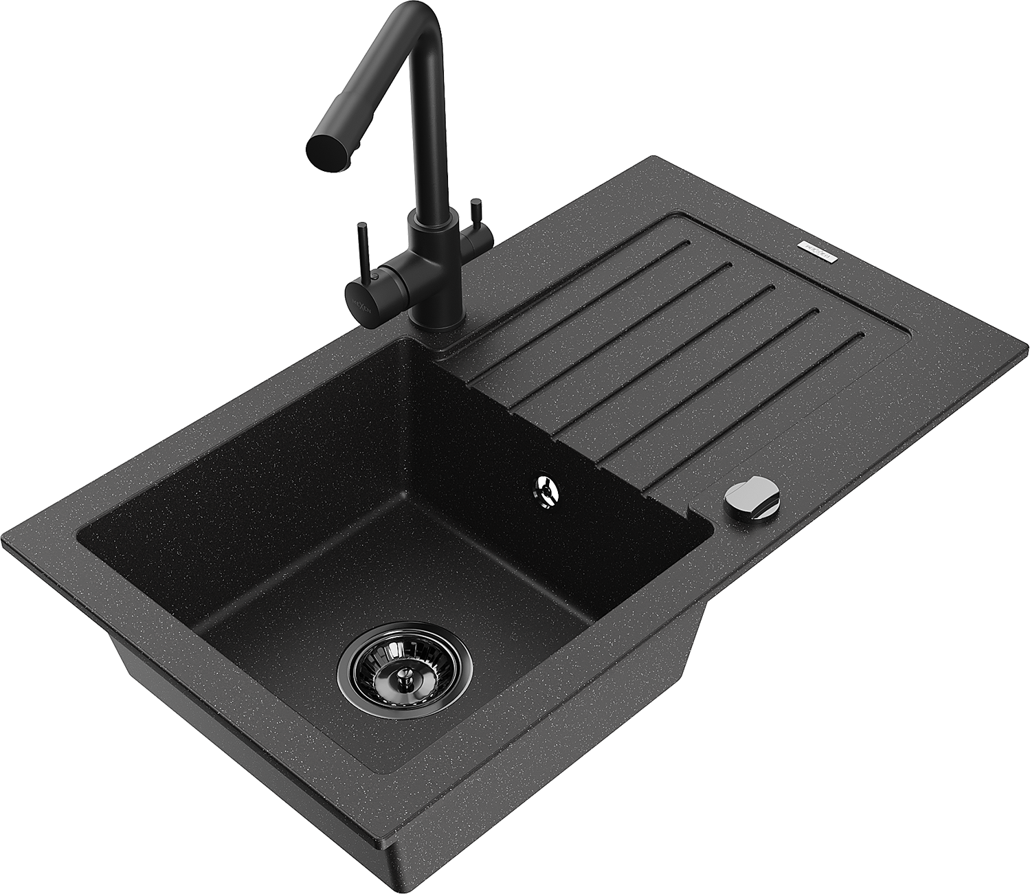 Mexen Pablo Granitspüle 1-becken mit Abtropffläche und Küchenarmatur Duero, Schwarz/Silber Metallic - 6510-73-671600-70-B