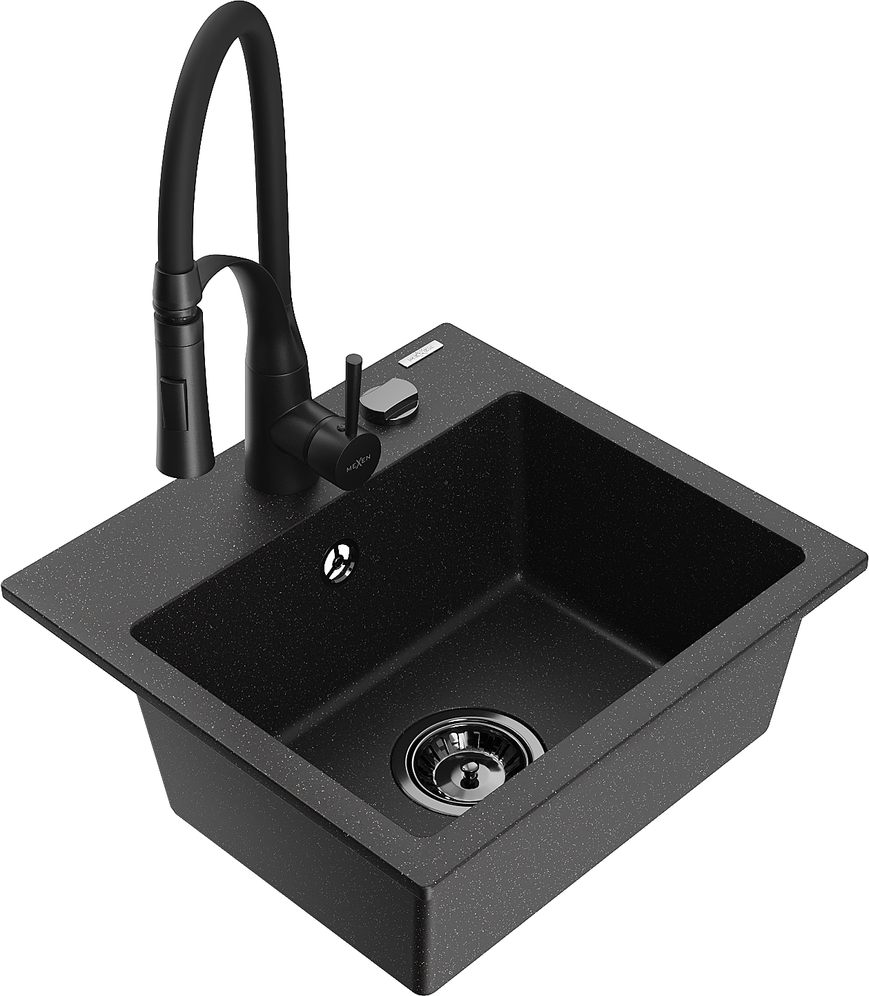 Mexen Milo Granitspüle 1-beckig mit Küchenarmatur Aster, schwarz/silberner Metallic - 6505-73-73450-70-B