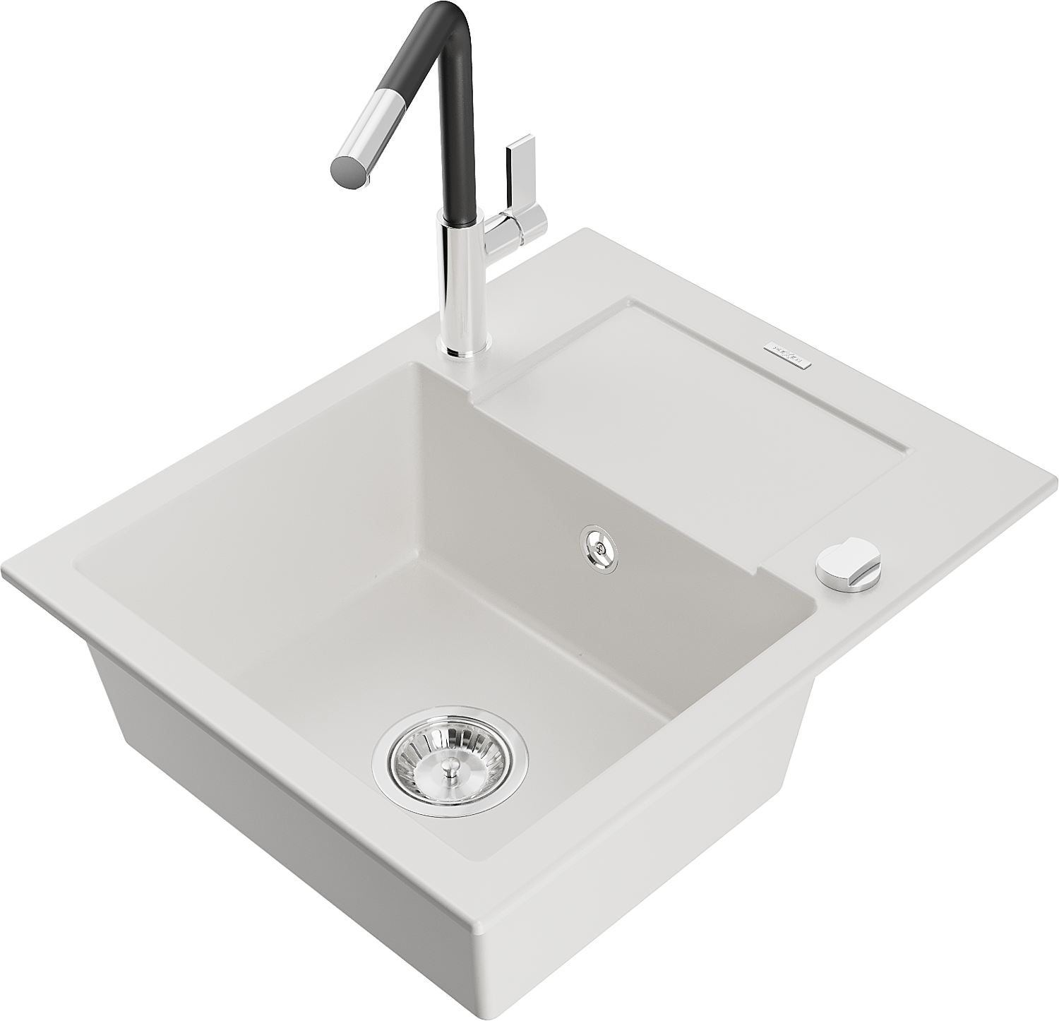 Mexen Enzo Granitspüle 1-Becken mit Abtropffläche und Küchenarmatur Flora, weiß - 6506-20-670401-07