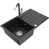 Mexen Bruno Granitspüle 1-Becken mit Abtropffläche und Küchenarmatur Flora, schwarz/silber Metallic - 6513-73-670401-07