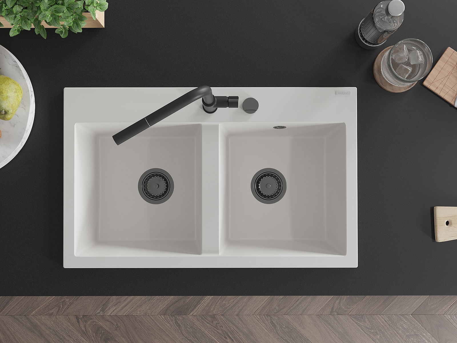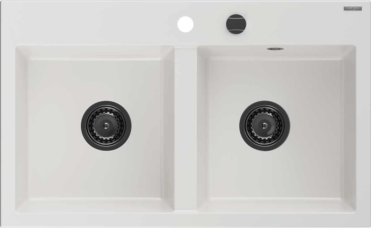 Mexen Hektor Granitspüle 2-Becken 800 x 480 mm, weiß, schwarzer Siphon - 6521802000-20-B