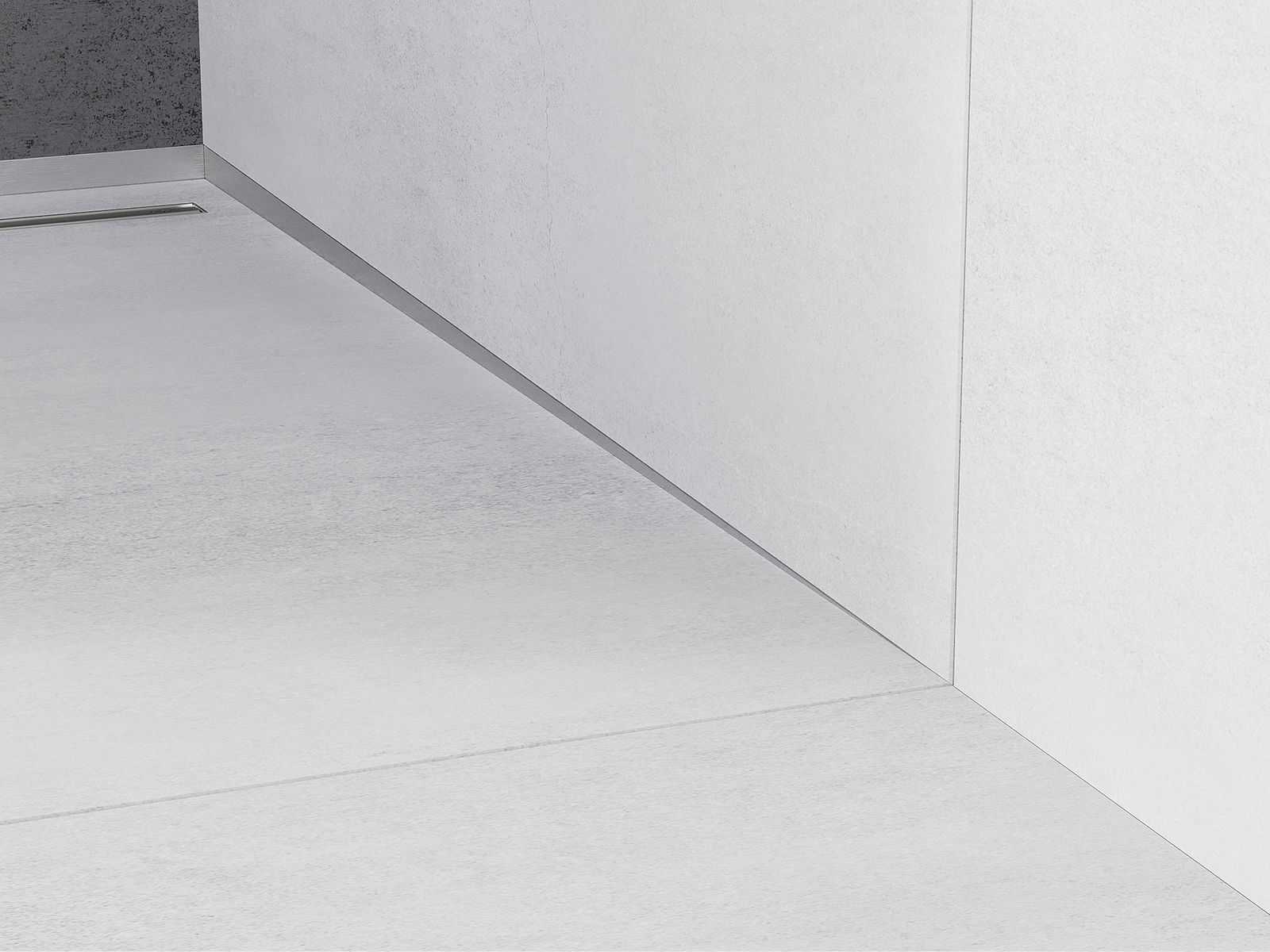 Die seitliche Kante der Leiste erzeugt ein einseitiges Gefälle zum linearen Abfluss, ohne dass ein sogenanntes Kuvert notwendig ist