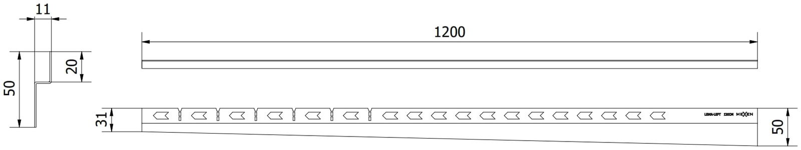 Die seitliche Kante der Leiste erzwingt ein einseitiges Gefälle zum Linienablauf, ohne dass ein sogenannter Umschlag erforderlich ist