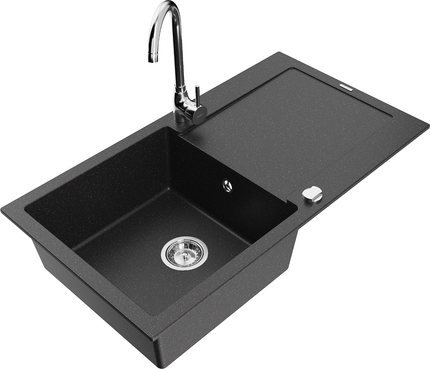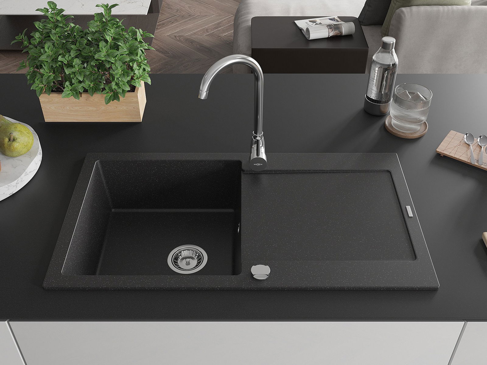 Mexen Leo Granitspüle 1-Kammer mit Abtropffläche und Küchenarmatur Telma, schwarz/silber metallic - 6501-73-670200-00