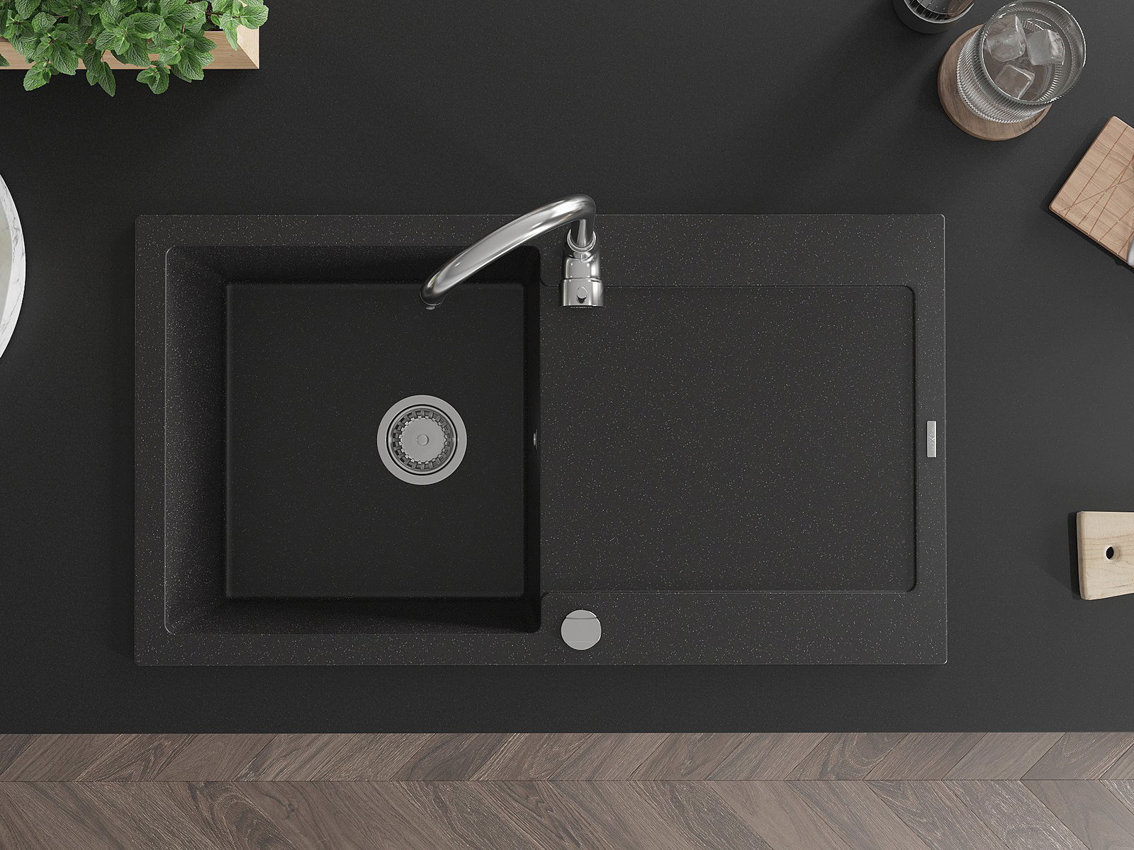 Dank des universellen Montagesystems ist die Spüle reversibel und der Abfluss kann links oder rechts auf der Theke montiert werden. Auf diese Weise können Sie die Seite einfach an Ihre Bedürfnisse und Bedingungen einstellen.