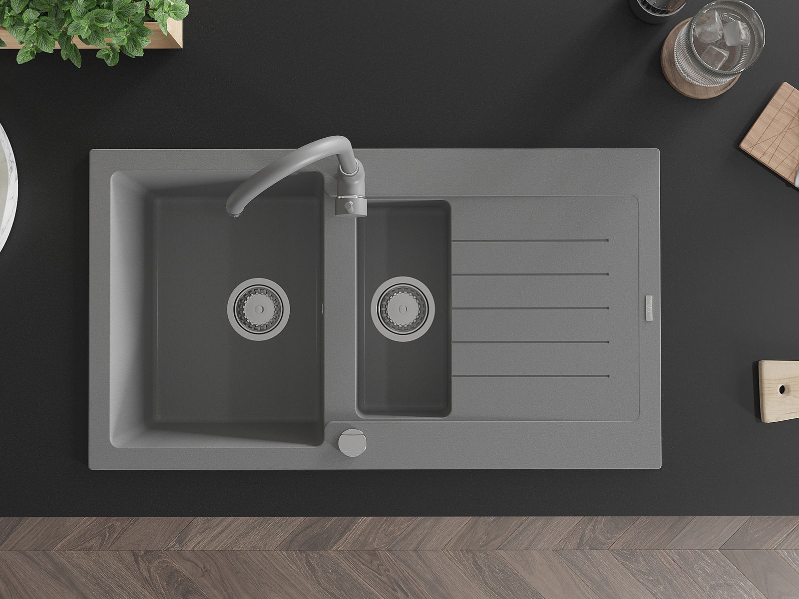 Die Spüle besteht aus hochwertigem Granit. Es ist eine elegante und vor allem praktische Ergänzung zu jeder Küche, unabhängig von ihrem Stil. Hohe Qualität und Granitdauer sorgen für eine langjährige Nutzung.