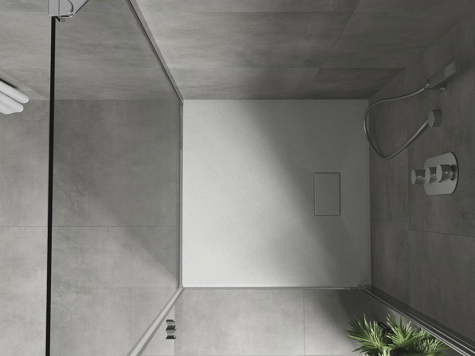 The surface of the shower tray resembles a stone with its structure. It is a unique combination of natural appearance with a modern interior arrangement. It adds character, emphasizes the aesthetics and elegance of the bathroom decor and impresses with its form.