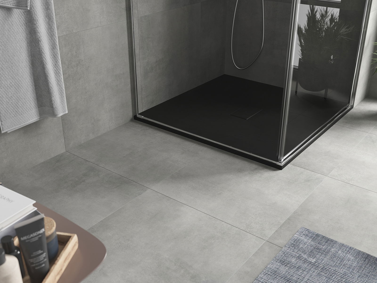 The surface of the shower tray resembles a stone with its structure. It is a unique combination of natural appearance with a modern interior arrangement. It adds character, emphasizes the aesthetics and elegance of the bathroom decor and impresses with its form.