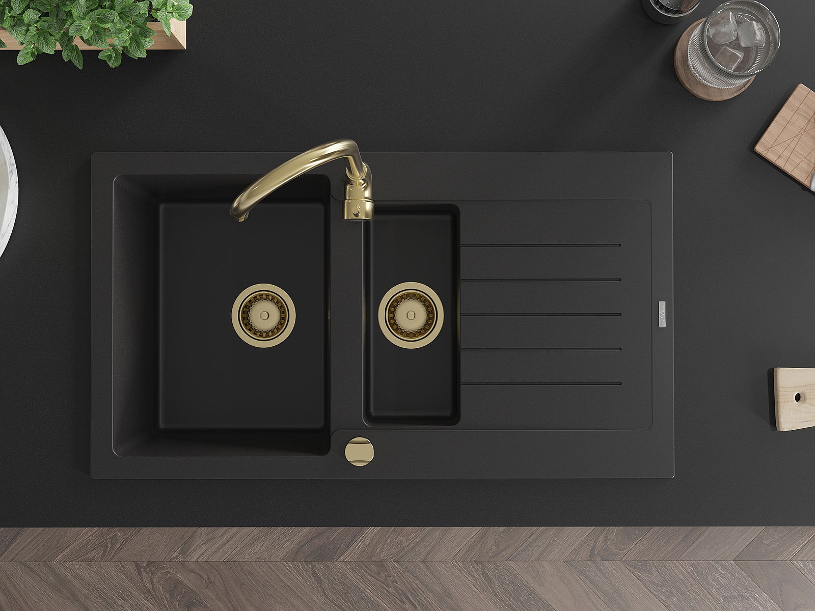 Mexen Matias granite sink 1.5-bowl with drainer 900 x 505 mm, black, gold siphon - 6502901505-77-G