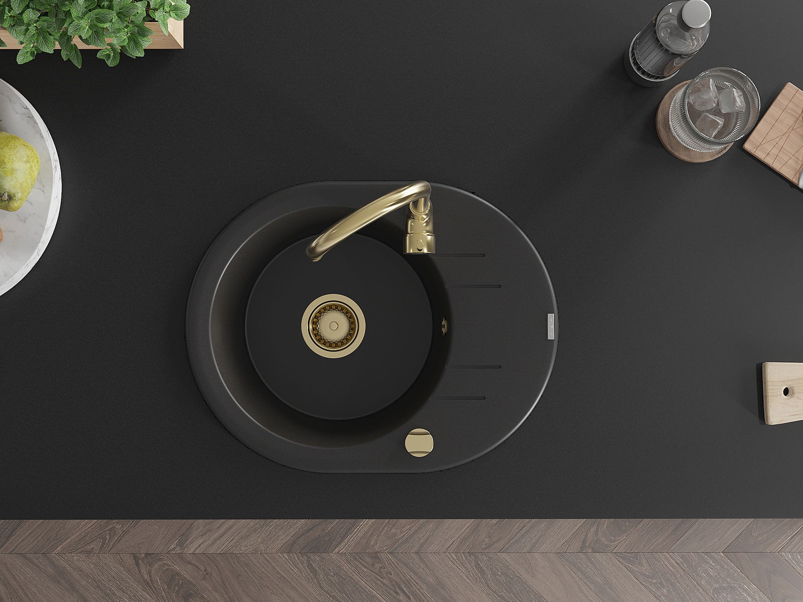 Mexen Kevin 1-bowl granite sink with drainer 586 x 458 mm, black, gold siphon - 6517581005-77-G