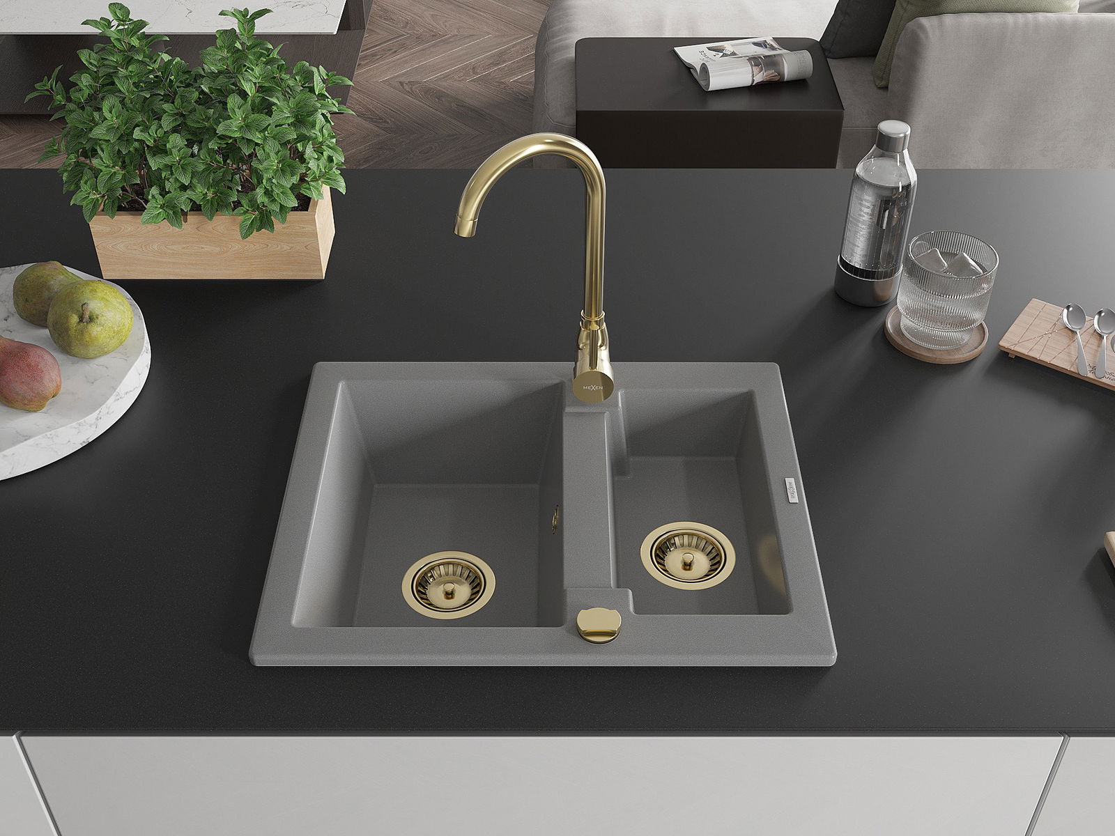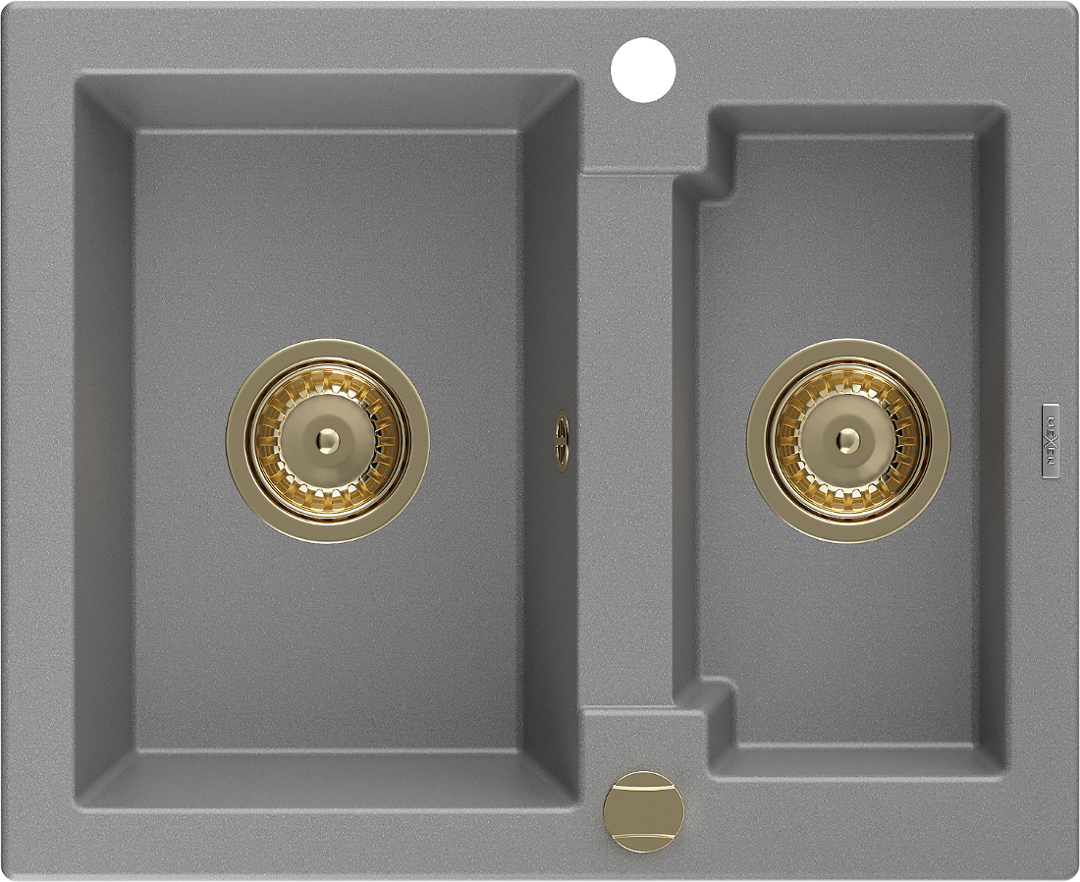 Mexen Carlos granite kitchen sink 1.5-bowl 582 x 475 mm, grey, gold siphon - 6518581500-71-G