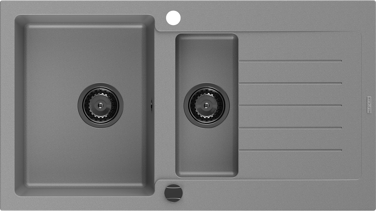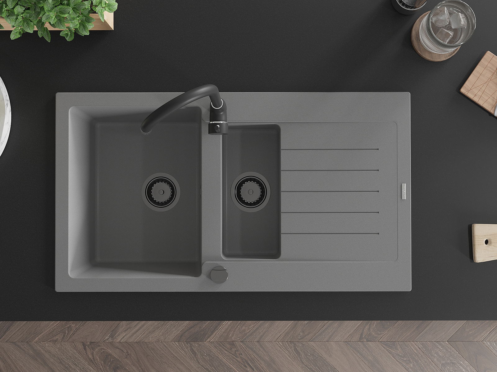 Mexen Matias 1.5-bowl granite sink with drainer 900 x 505 mm, grey, black siphon - 6502901505-71-B