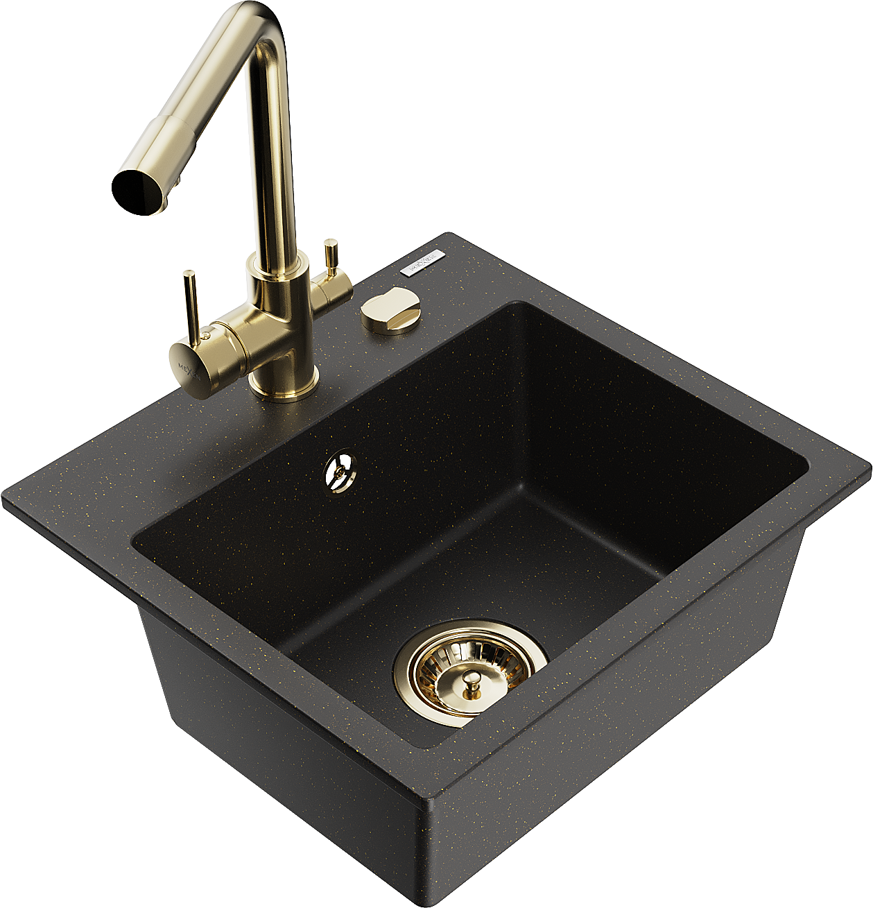 Mexen Milo 1-bowl granite kitchen sink with Duero tap, black/gold metallic - 6505-75-671600-50