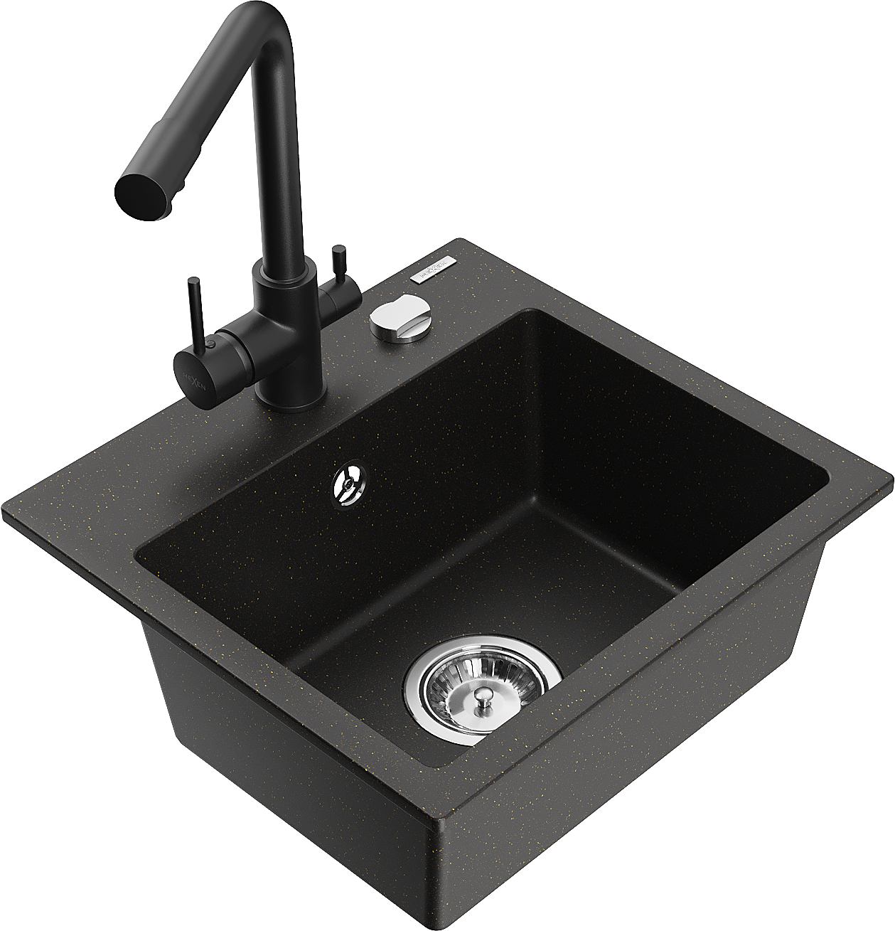 Mexen Milo granite sink 1-bowl with Duero kitchen tap, black/gold metallic - 6505-75-671600-70