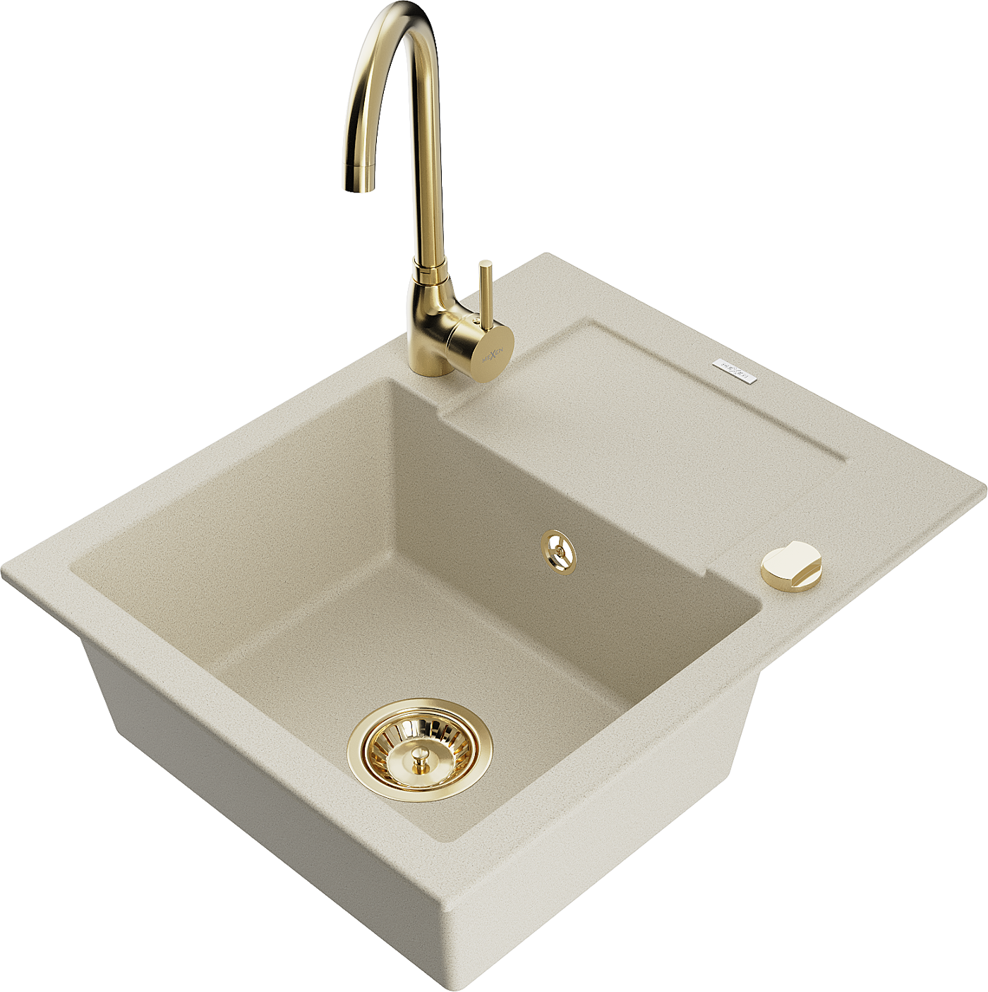 Mexen Enzo one-bowl granite sink with drainer and Telma kitchen tap, beige - 6506-69-670200-50