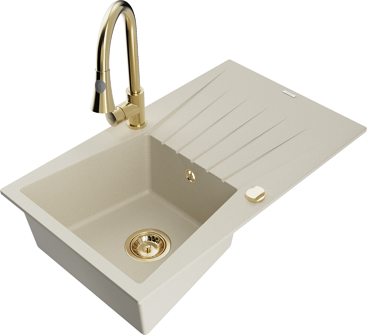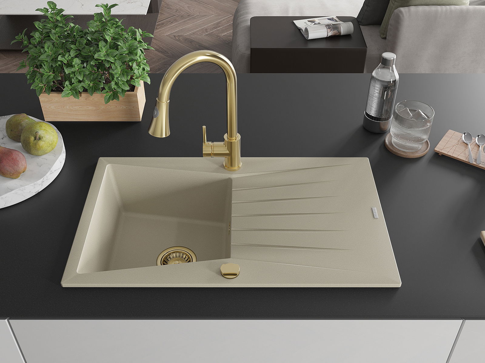 Mexen Cesar granite sink 1-bowl with drainer and Elia kitchen tap, beige - 6514-69-670101-50