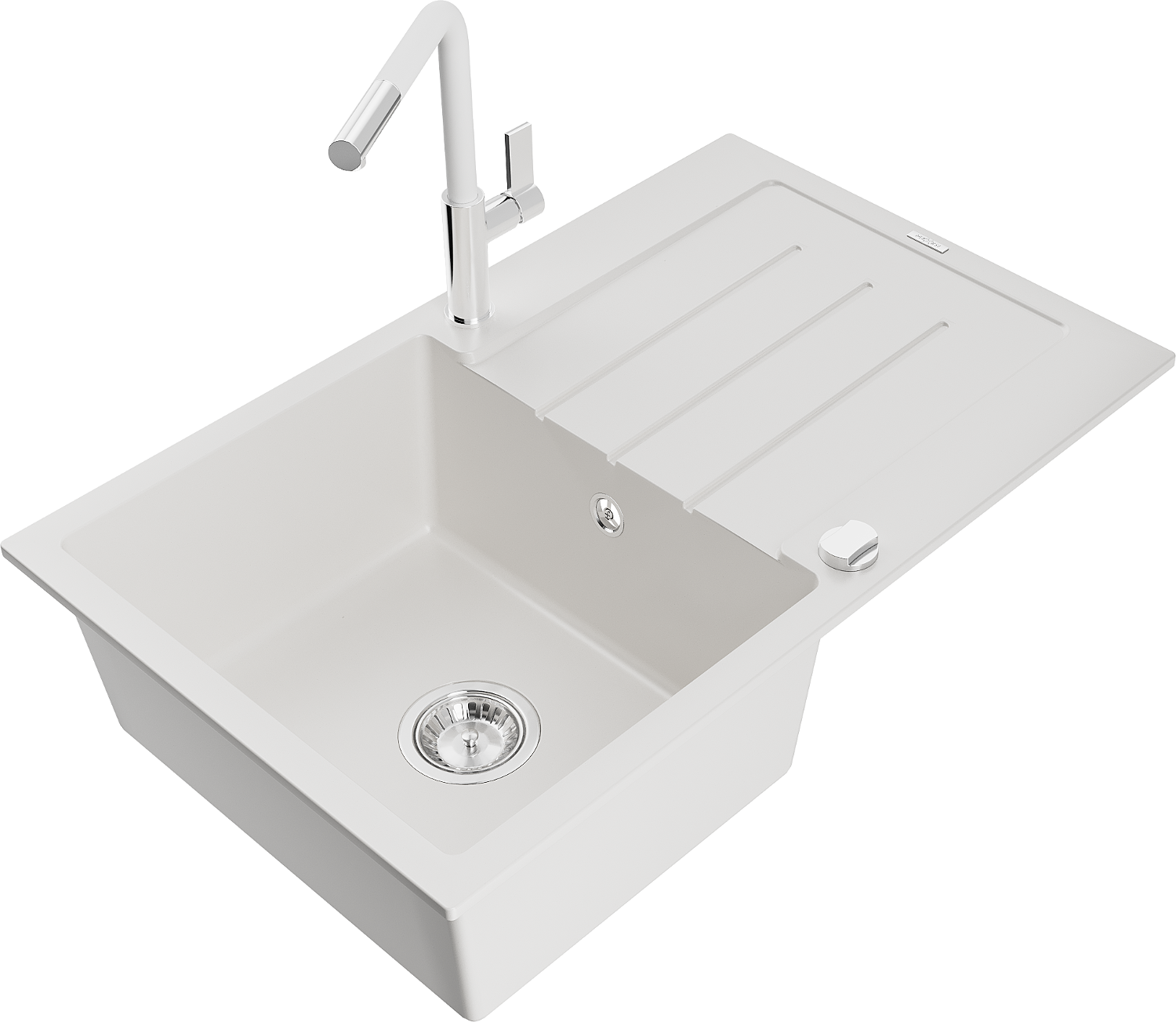 Mexen Bruno 1-bowl granite sink with drainer and Flora kitchen tap, white - 6513-20-670401-02