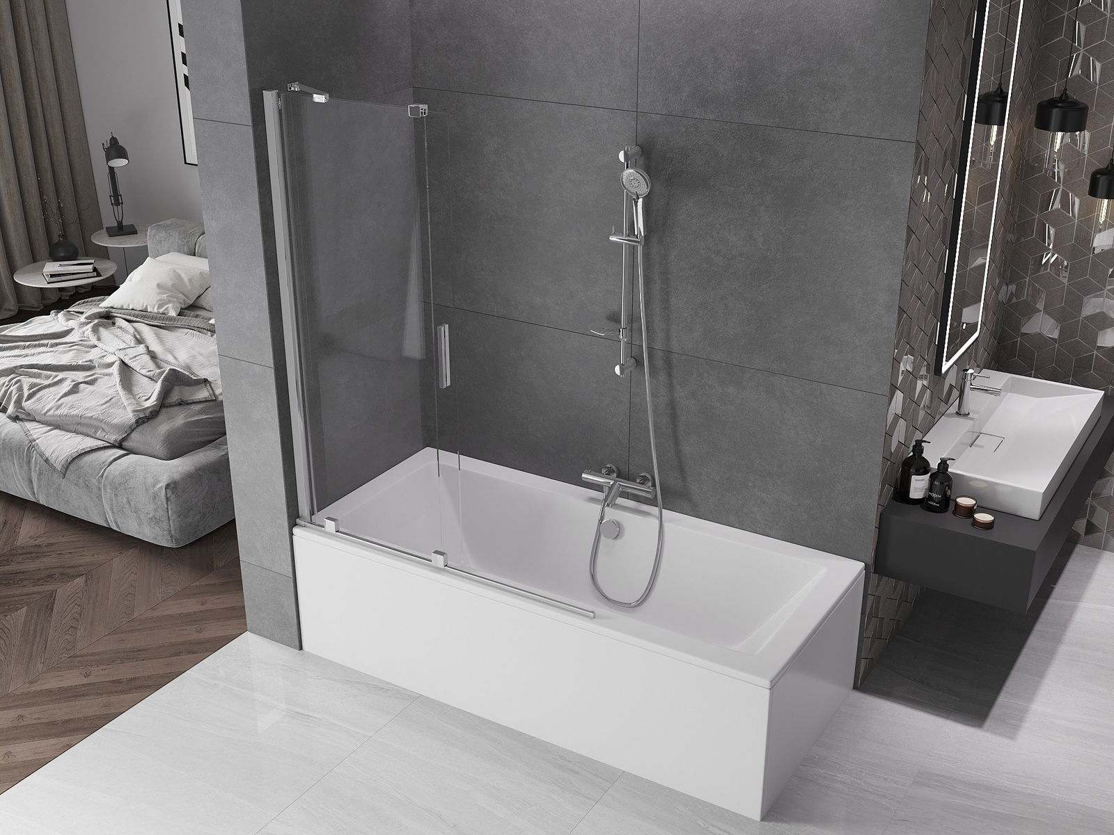 The sliding screen is a practical and space-saving solution as it does not require additional space for opening. Its design is based on a system of guides that allow the leaf to slide smoothly, and built-in rollers provide protection against dirt and limescale build-up on the bearing components.