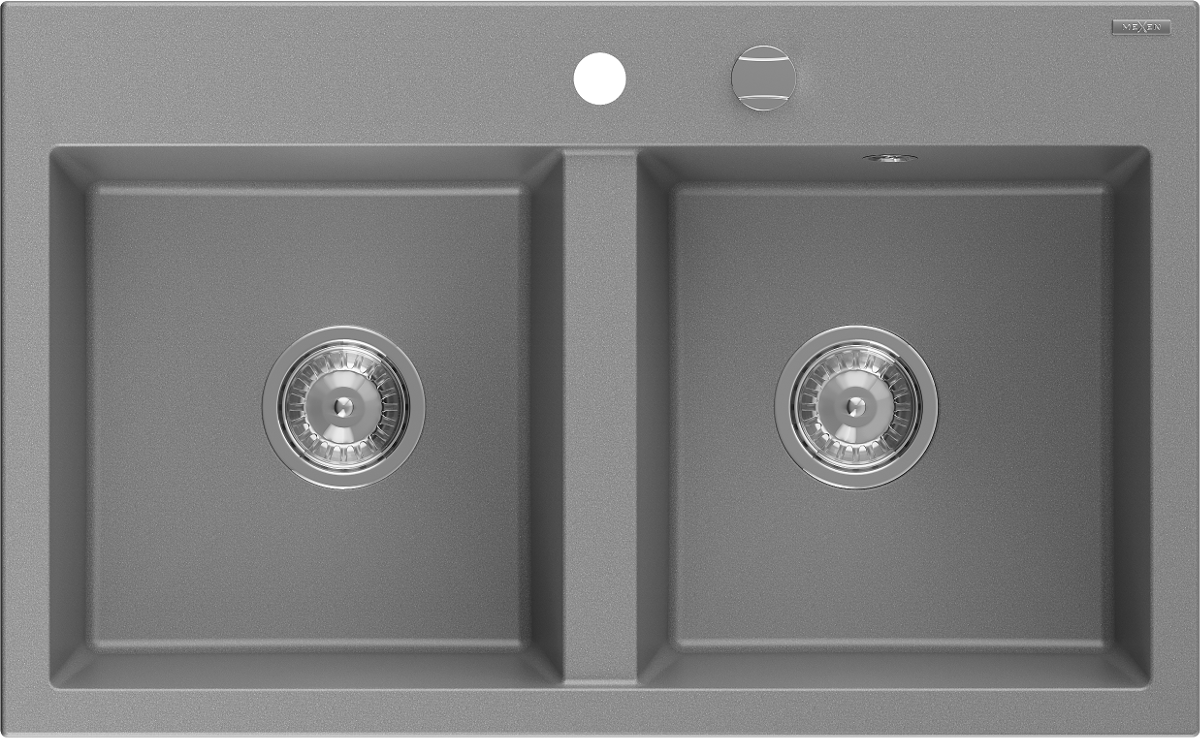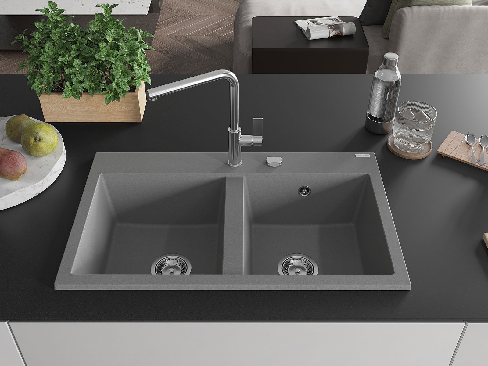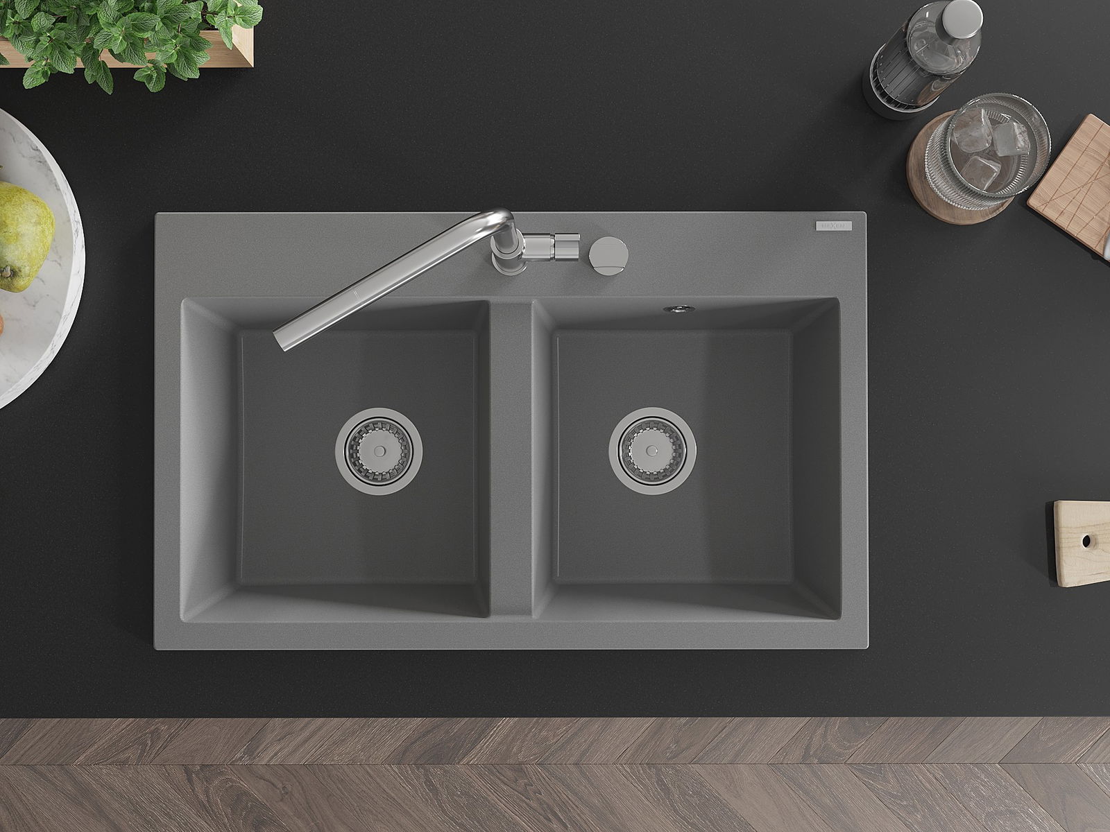 Mexen Hektor granite sink 2-chamber 800 x 480 mm, grey, chrome siphon - 6521802000-71