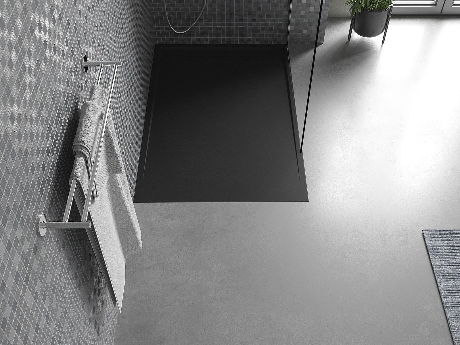 The surface of the shower tray resembles a stone with its structure. It is a unique combination of natural appearance with a modern interior arrangement. It adds character, emphasizes the aesthetics and elegance of the bathroom decor and impresses with its form.