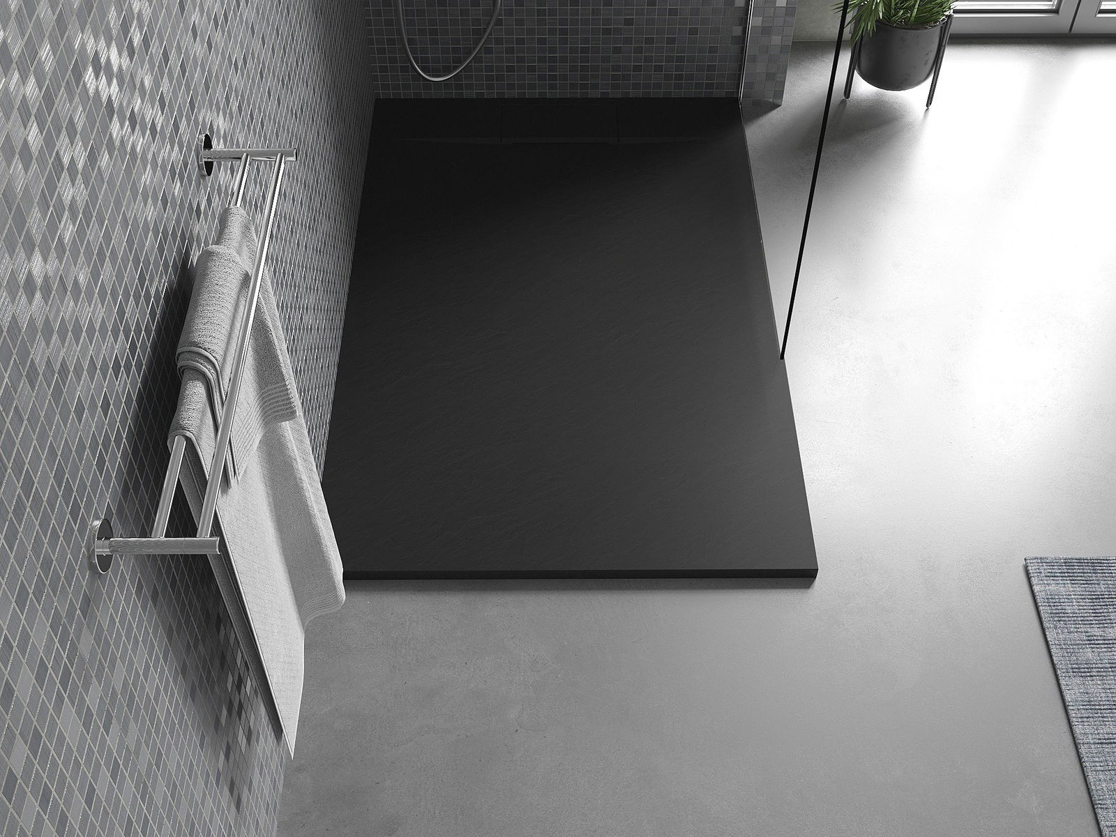 The surface of the shower tray resembles a stone with its structure. It is a unique combination of natural appearance with a modern interior arrangement. It adds character, emphasizes the aesthetics and elegance of the bathroom decor and impresses with its form.