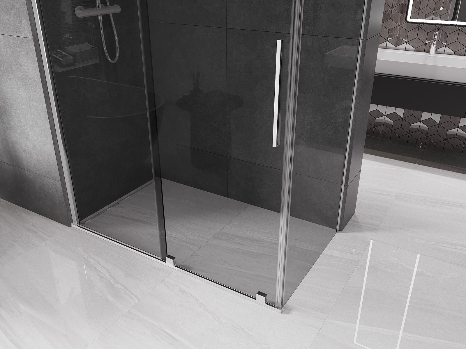 A handy and convenient handle made of stainless steel. The stylish shape combined with a finish that matches the color of the profiles gives a modern and stylish look, highlighting the aesthetics of any bathroom.
