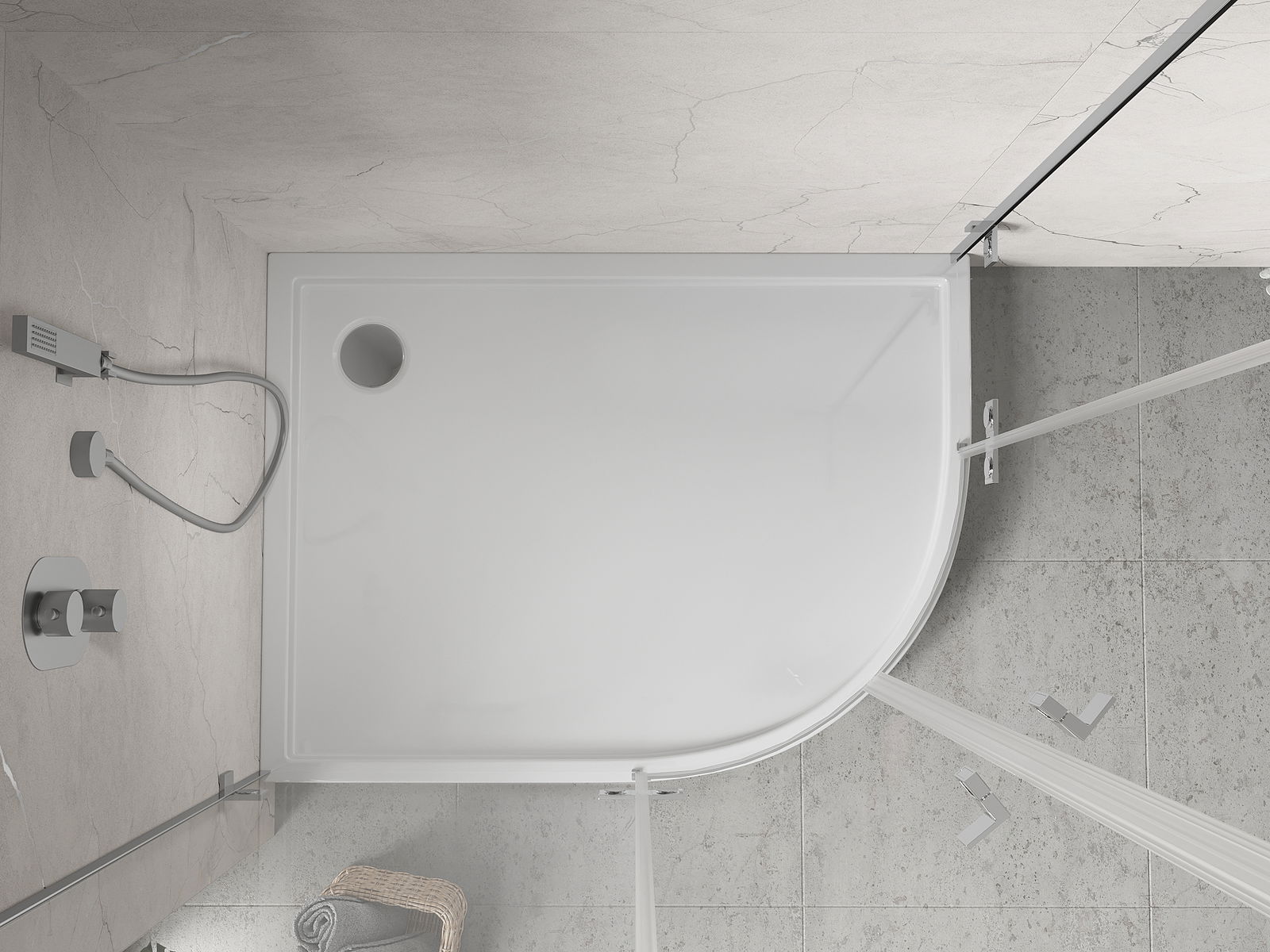 The shower tray is designed in such a way that water can freely flow towards the drain. It ensures quick and effective drainage of water from the surface of the shower tray, preventing the formation of puddles and flooding the bathroom.