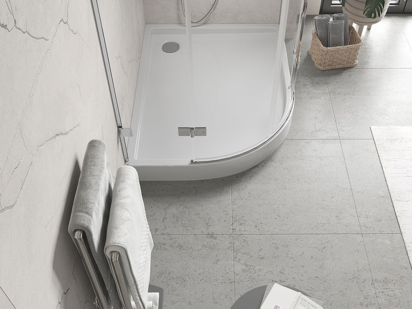 The shower tray is designed in such a way that water can freely flow towards the drain. It ensures quick and effective drainage of water from the surface of the shower tray, preventing the formation of puddles and flooding the bathroom.