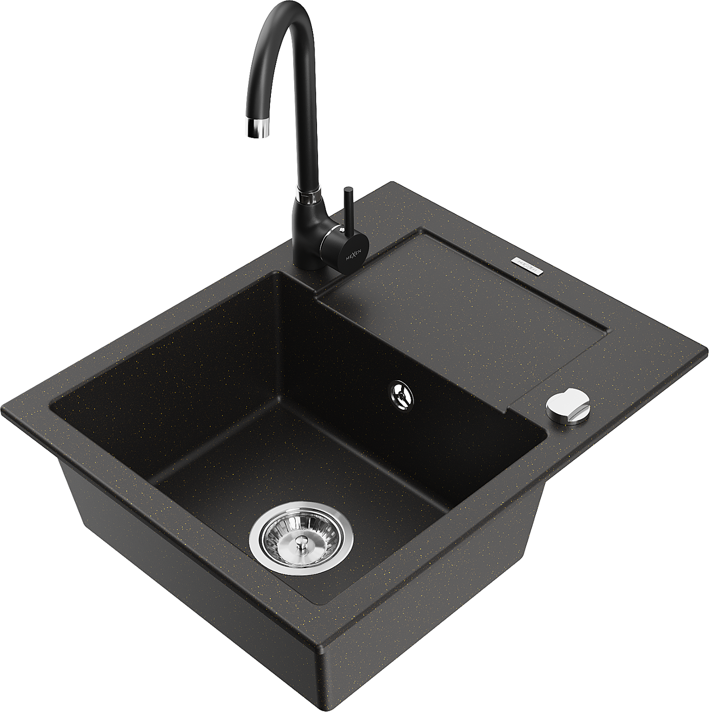Mexen Enzo granite kitchen sink one-bowl with drainer and Telma kitchen tap, black/gold - 6506-75-670200-70