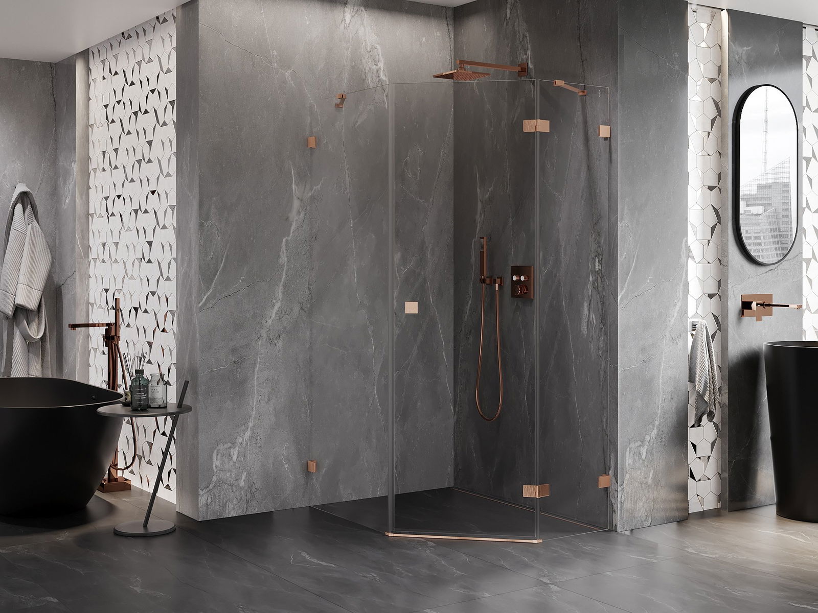 Mexen Lunar pentagonal swing shower cabin right 80 x 100 cm, transparent, brushed copper - 831-080P-100L-65-00-P