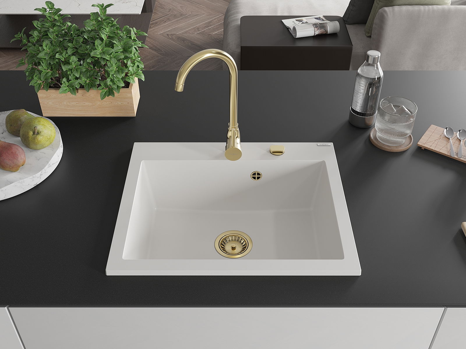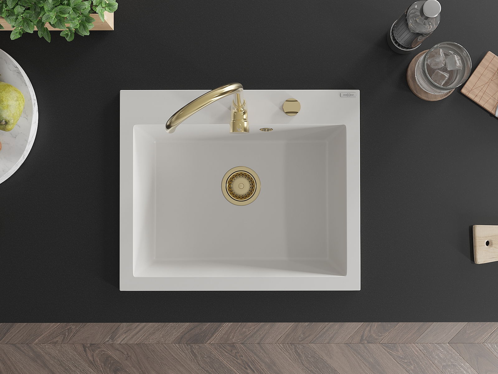 Mexen Elix granite sink 1-bowl 600 x 500 mm, white, gold siphon - 6525601005-20-G