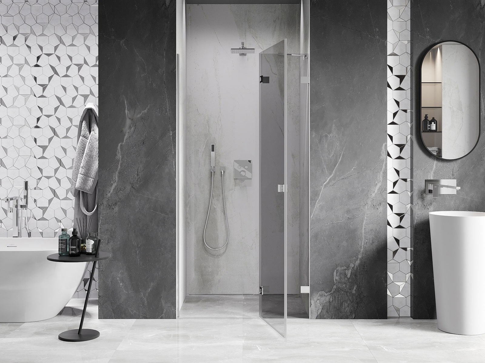 A handy and comfortable handle made from durable and resistant metal. Its trendy shape combined with a finish matched to the colour of the profiles gives the whole a modern and stylish look, highlighting the aesthetics of every bathroom.