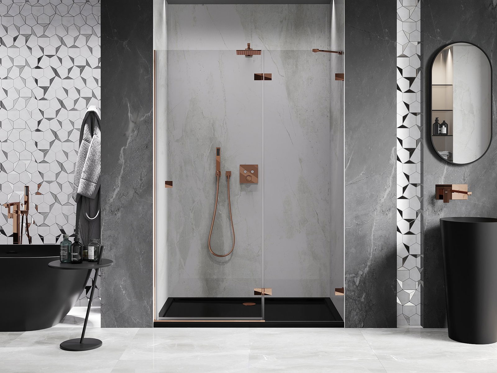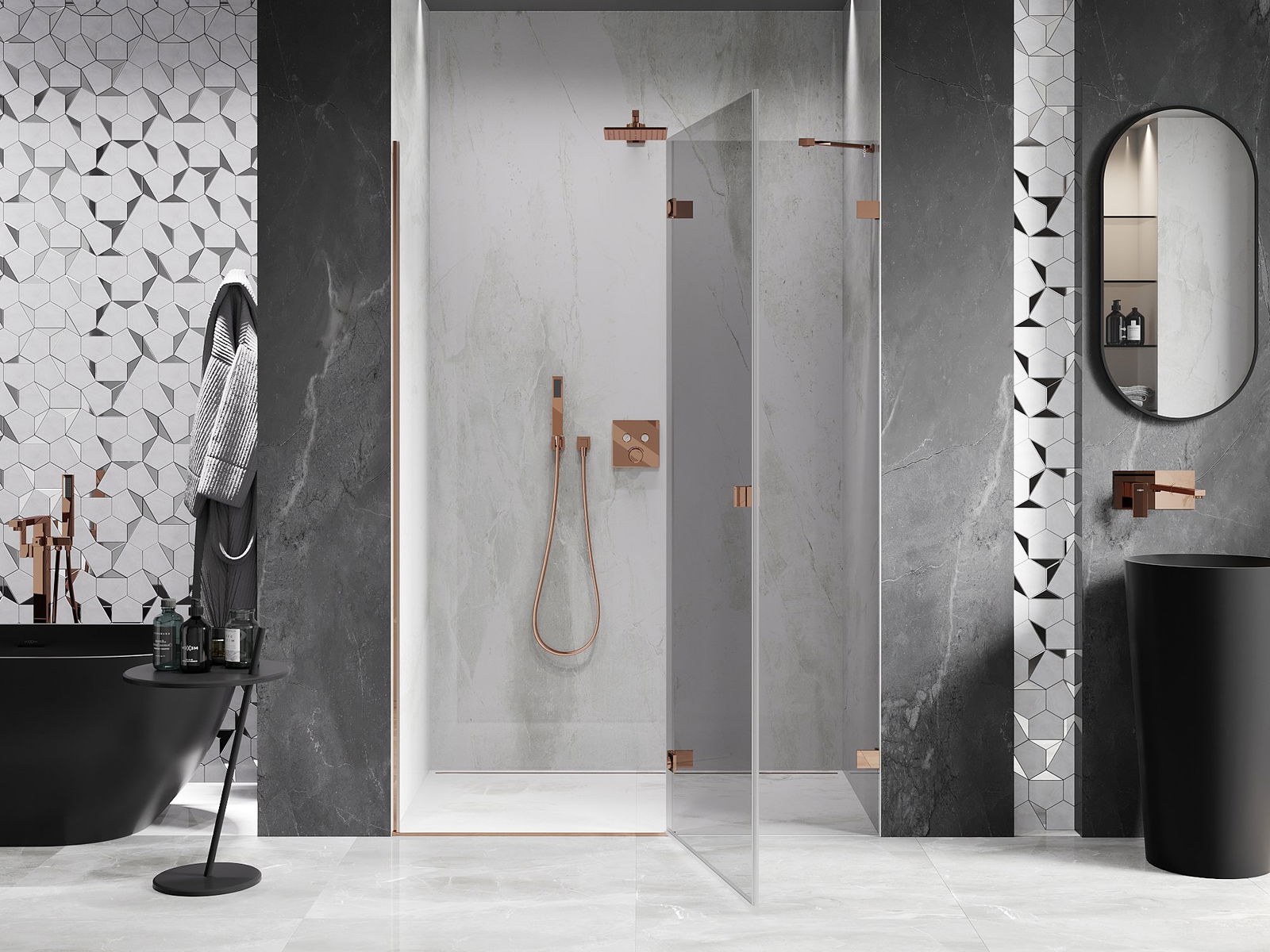 Clamps and hinges are made from very durable brass, additionally creating a flush glass surface. This is an excellent choice that combines elegance, durability, and modern design. Such solutions enhance the aesthetic of the shower while also making it easier to maintain cleanliness.