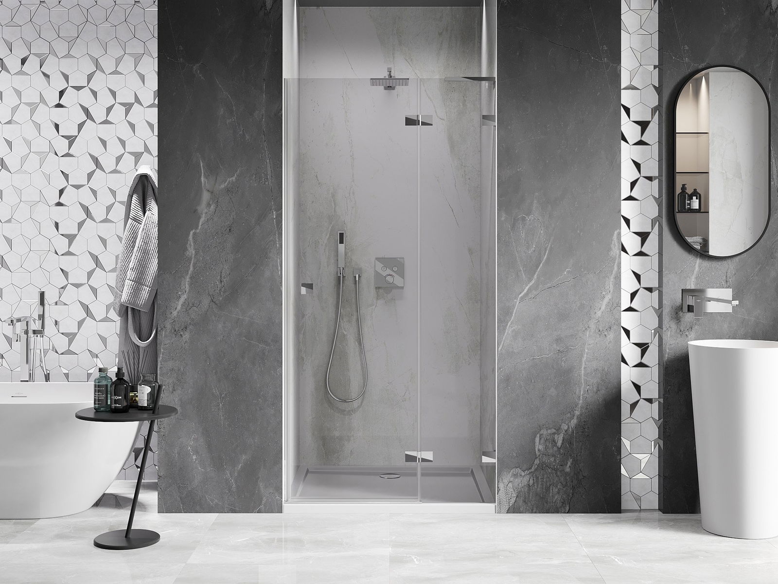 A handy and comfortable handle made from durable and resistant metal. Its trendy shape combined with a finish matched to the colour of the profiles gives the whole a modern and stylish look, highlighting the aesthetics of every bathroom.