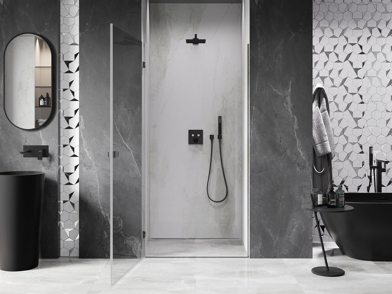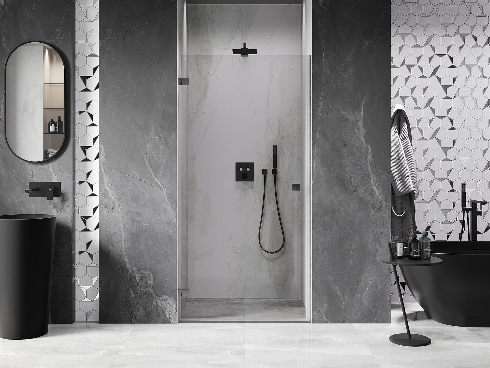A handy and comfortable handle made from durable and resistant metal. Its trendy shape combined with a finish matched to the colour of the profiles gives the whole a modern and stylish look, highlighting the aesthetics of every bathroom.
