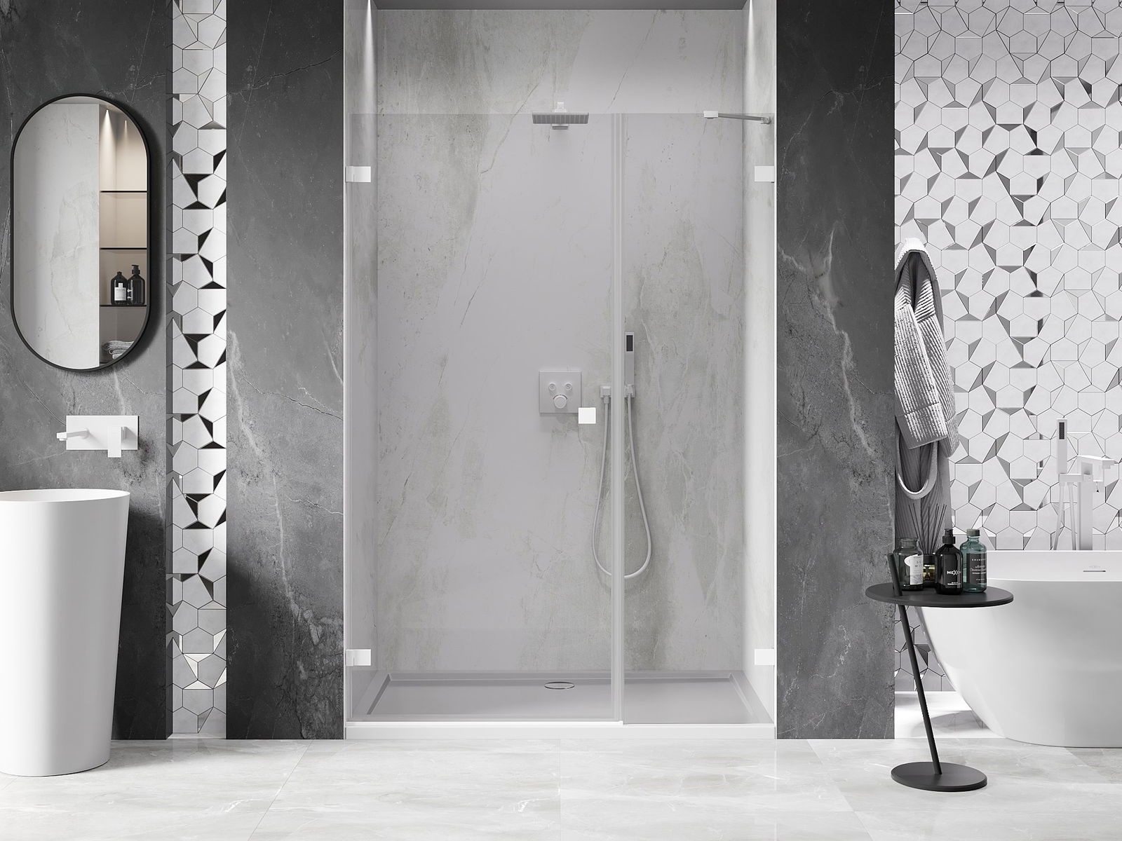 A handy and comfortable handle made from durable and resistant metal. Its trendy shape combined with a finish matched to the colour of the profiles gives the whole a modern and stylish look, highlighting the aesthetics of every bathroom.